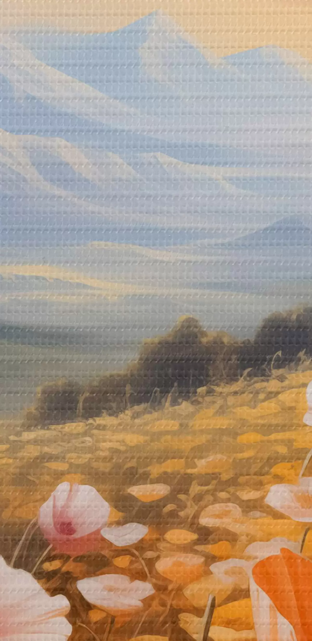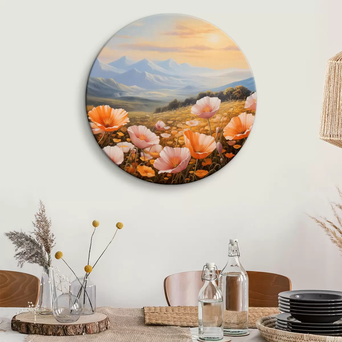 Кругла картина Поле маків на світанку з горами на задньому плані Nr r40730