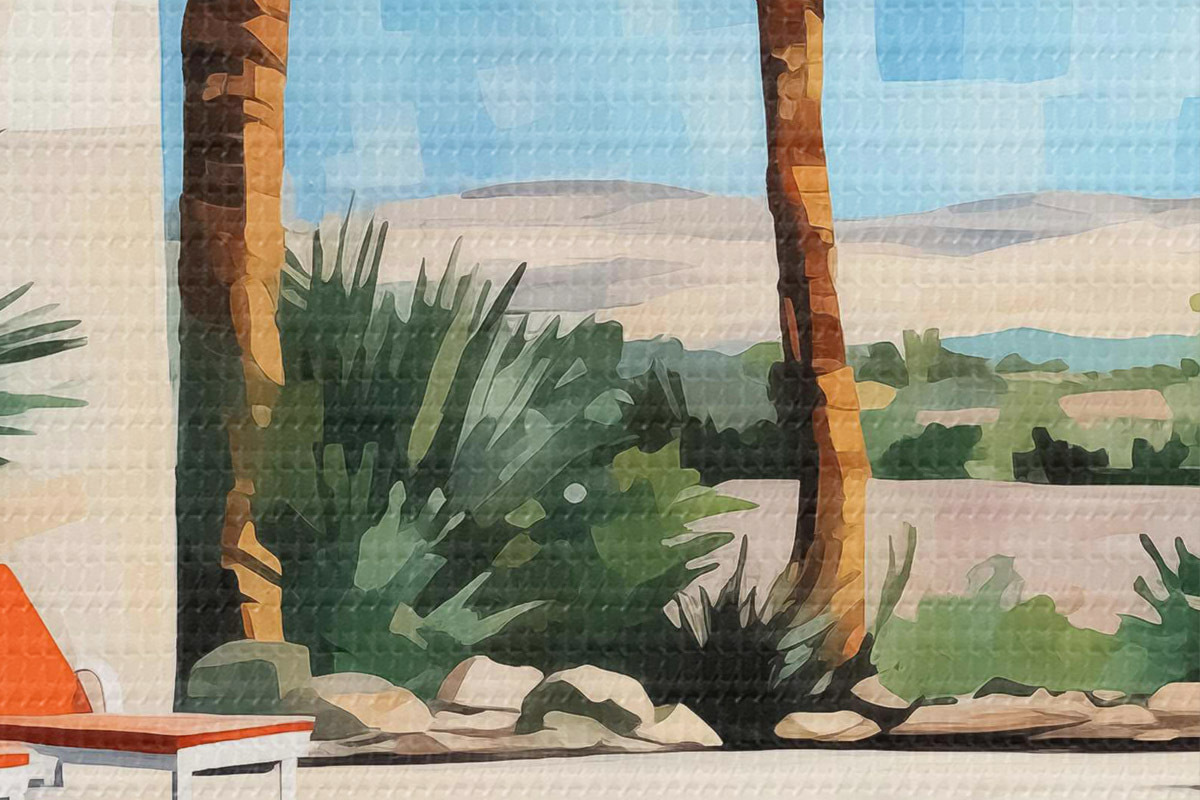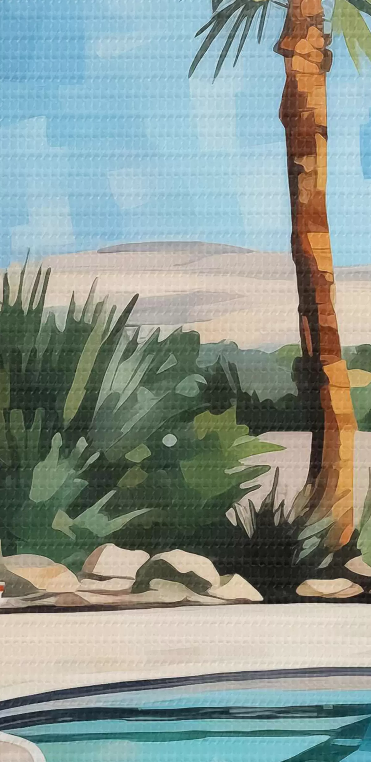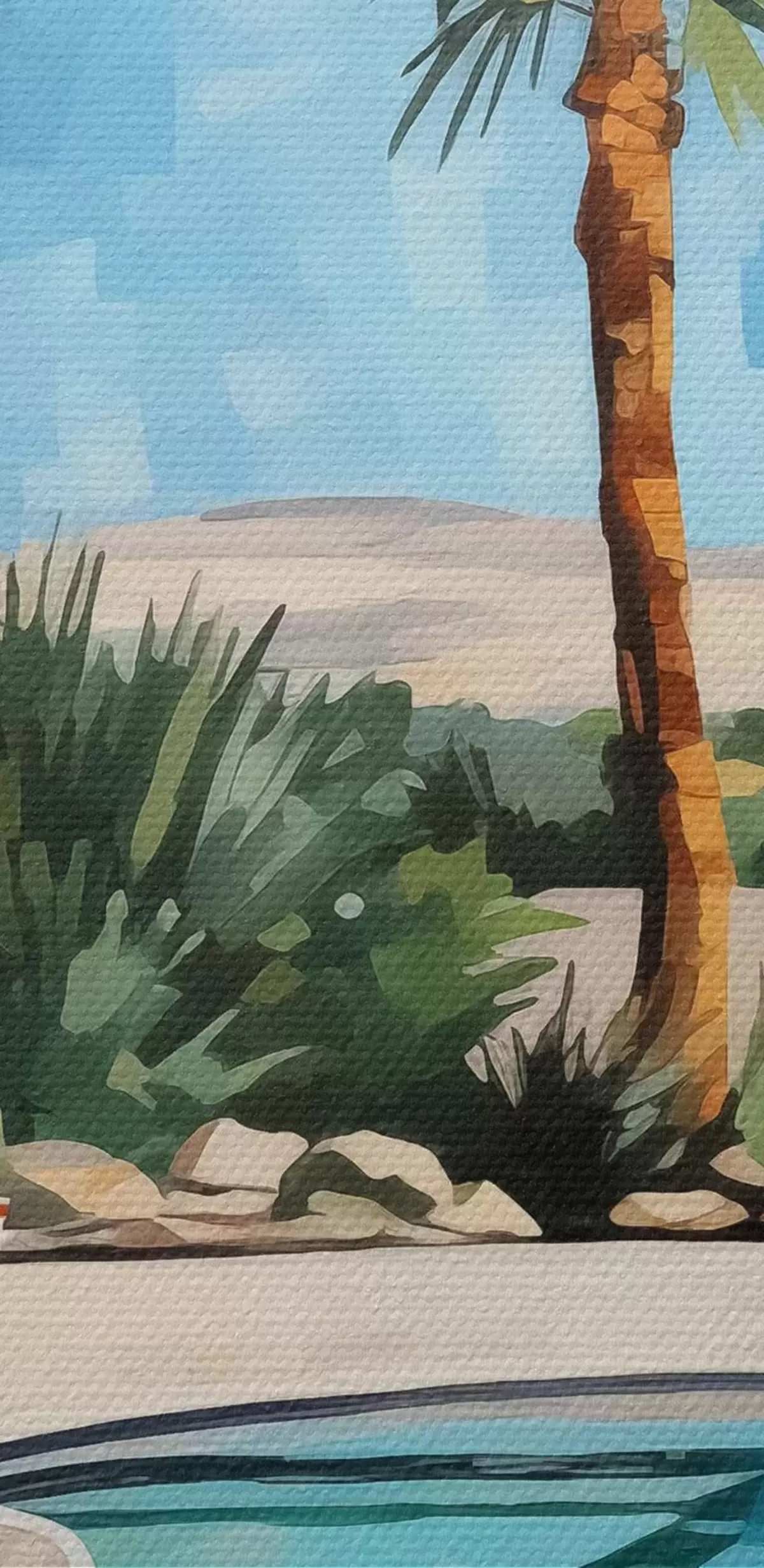 Кругла картина Пальми біля готелю з басейном біля скель, синій, зелений, червоний кольори Nr r40748