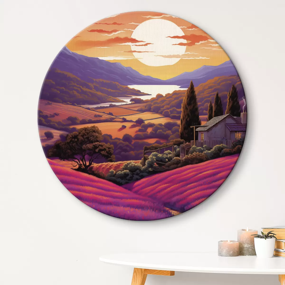 Кругла картина Лавандові поля, захід сонця, красиві пейзажі, гори Nr r40943