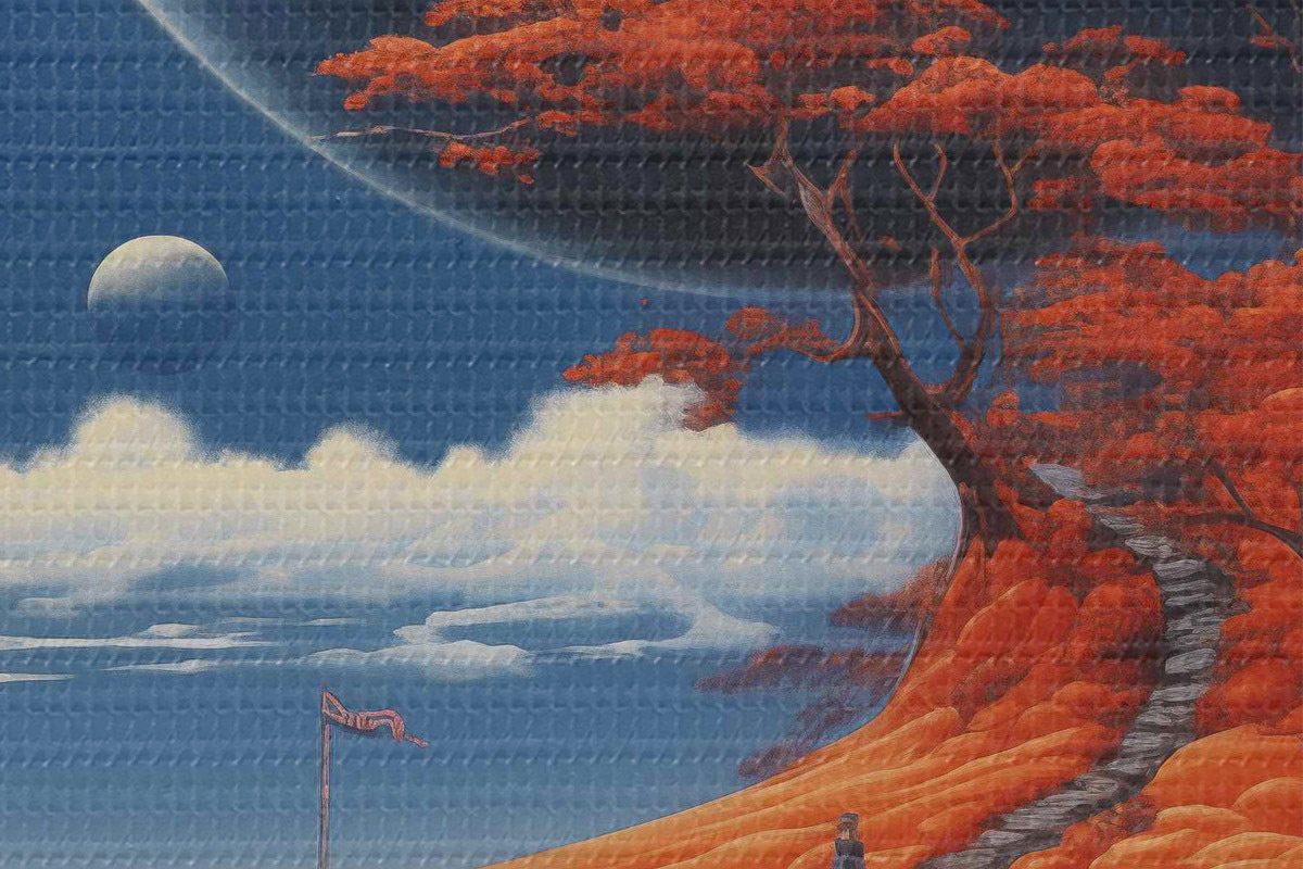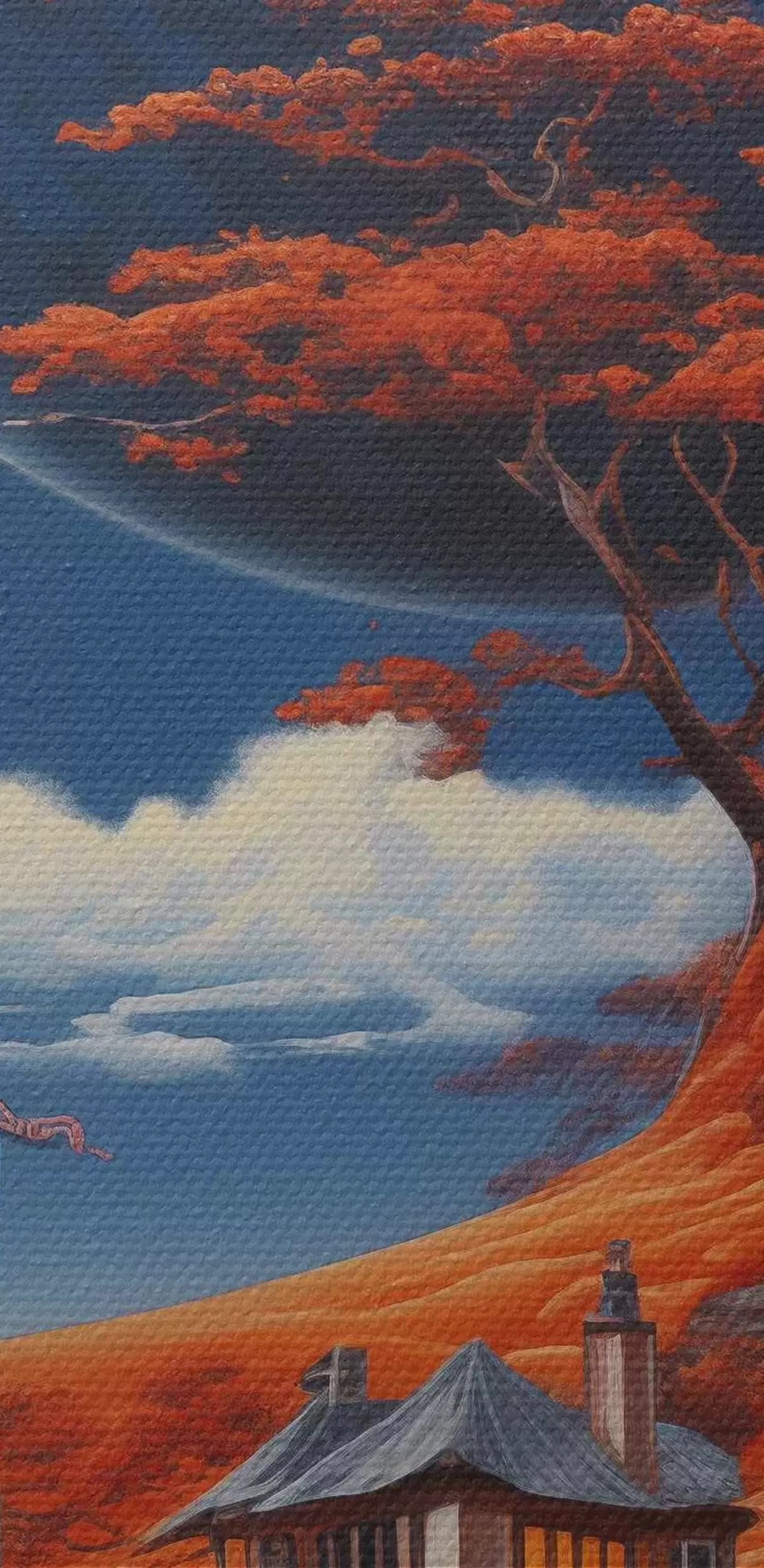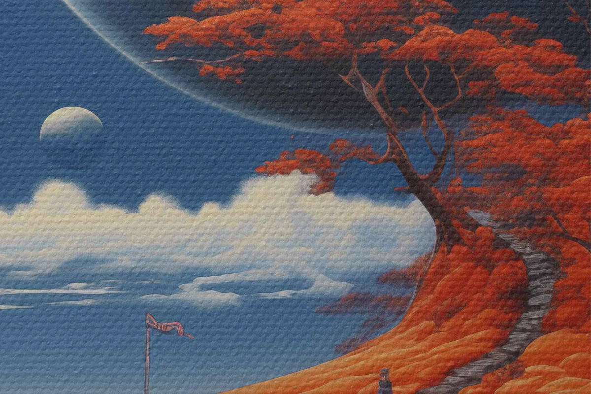 Кругла картина Космічна ілюстрація, планети, блакитне небо, будинок на пагорбі, дерева r40946