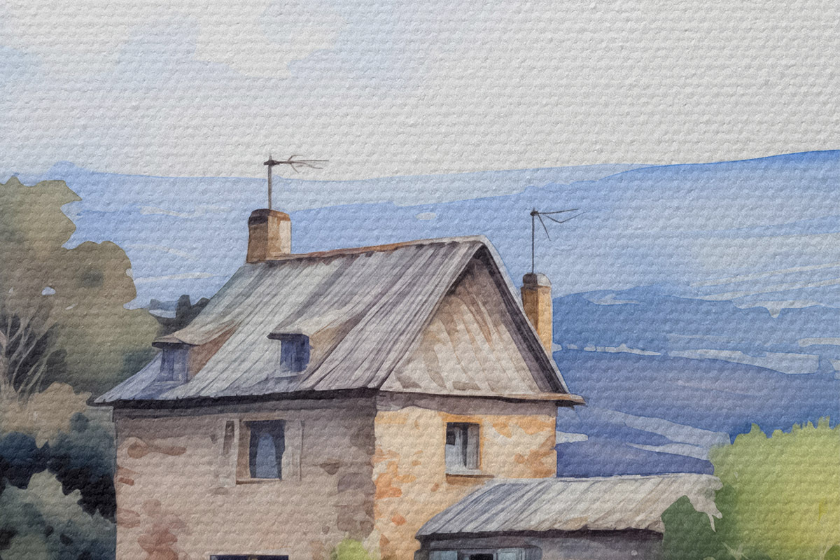 Кругла картина Заміський будинок з горами на задньому плані біля лавандового поля Nr r41012
