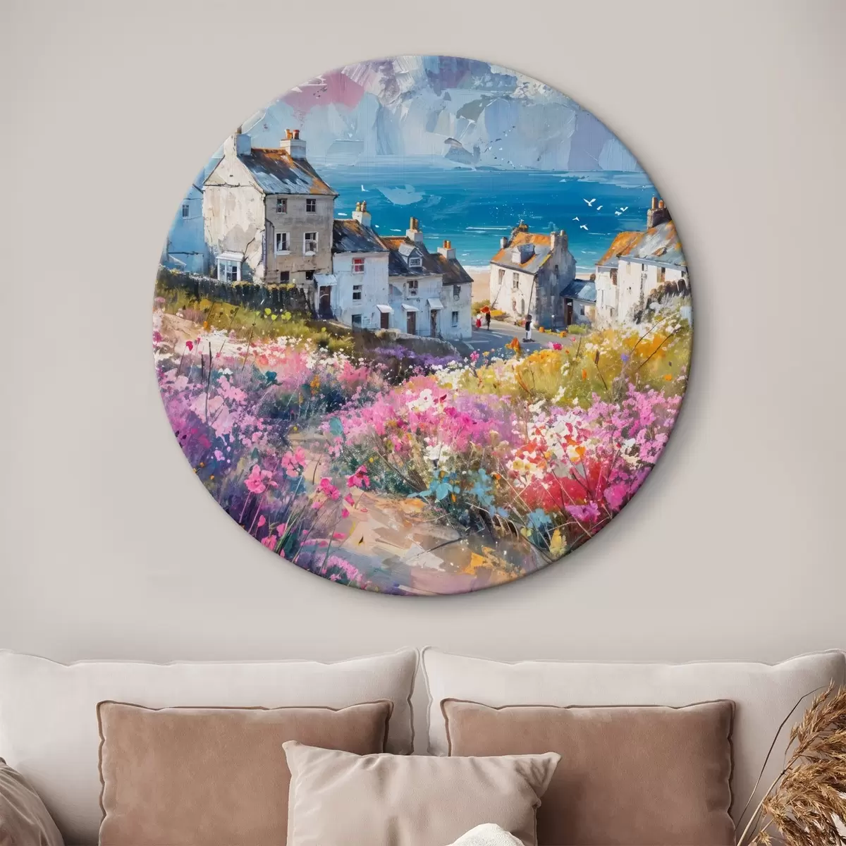Кругла картина Барвиста картина олією із зображенням приморського містечка з білими будиночками та яскравим квітковим садом на передньому плані Nr r41090