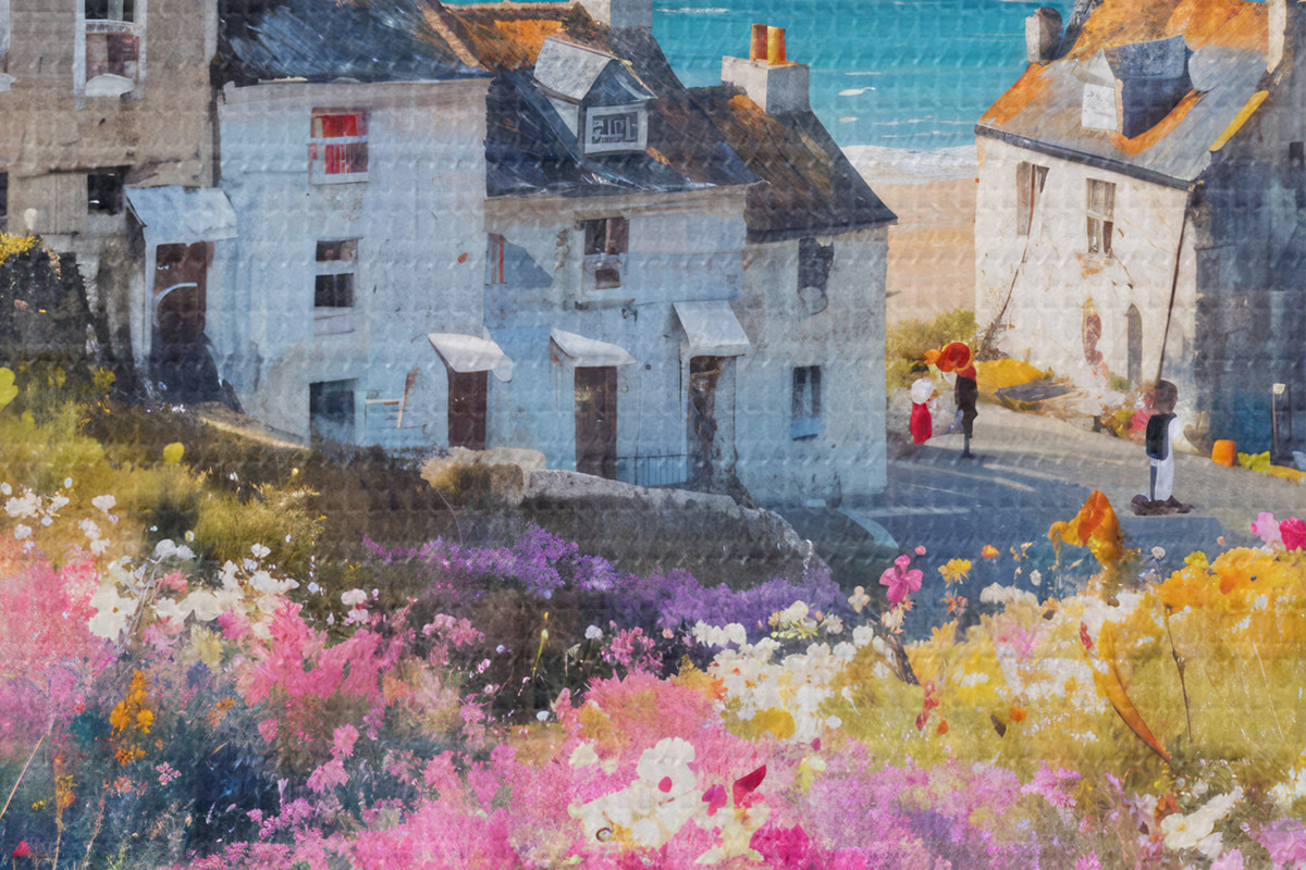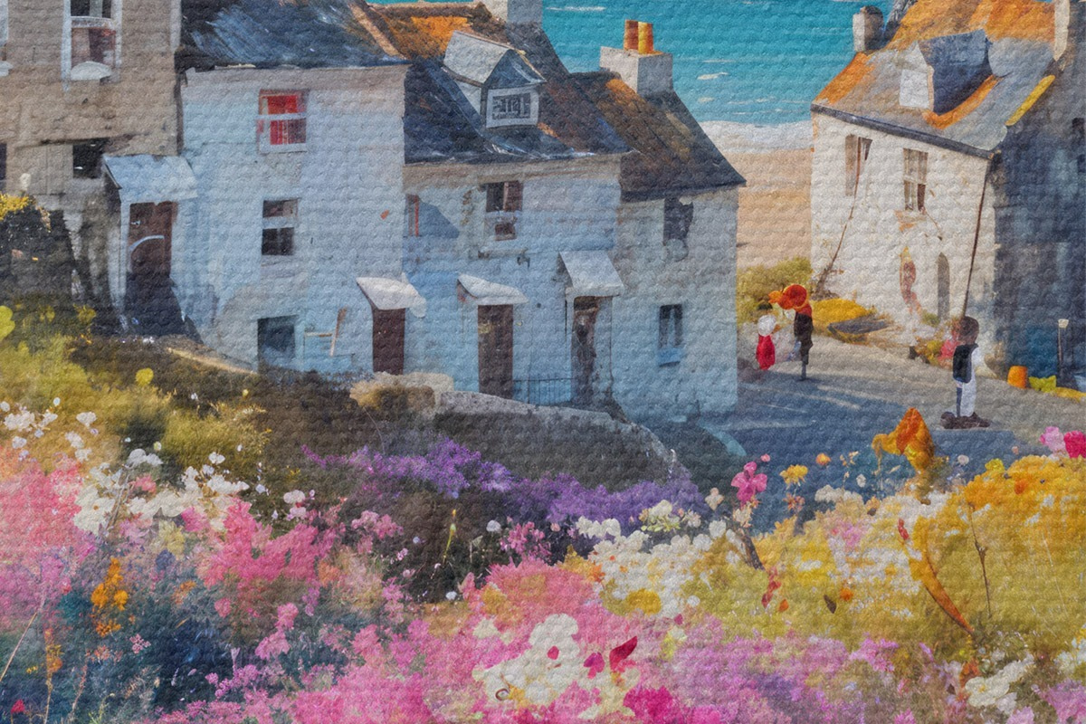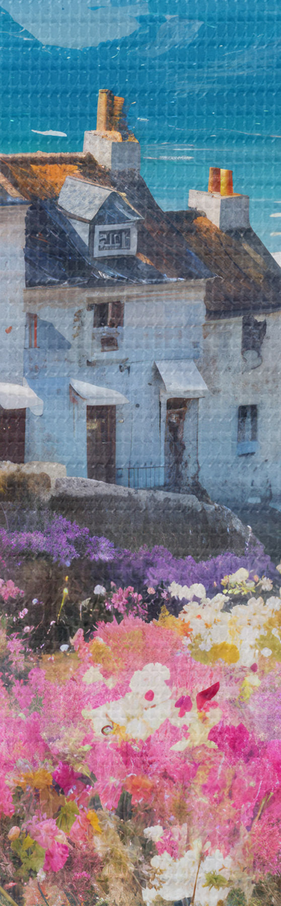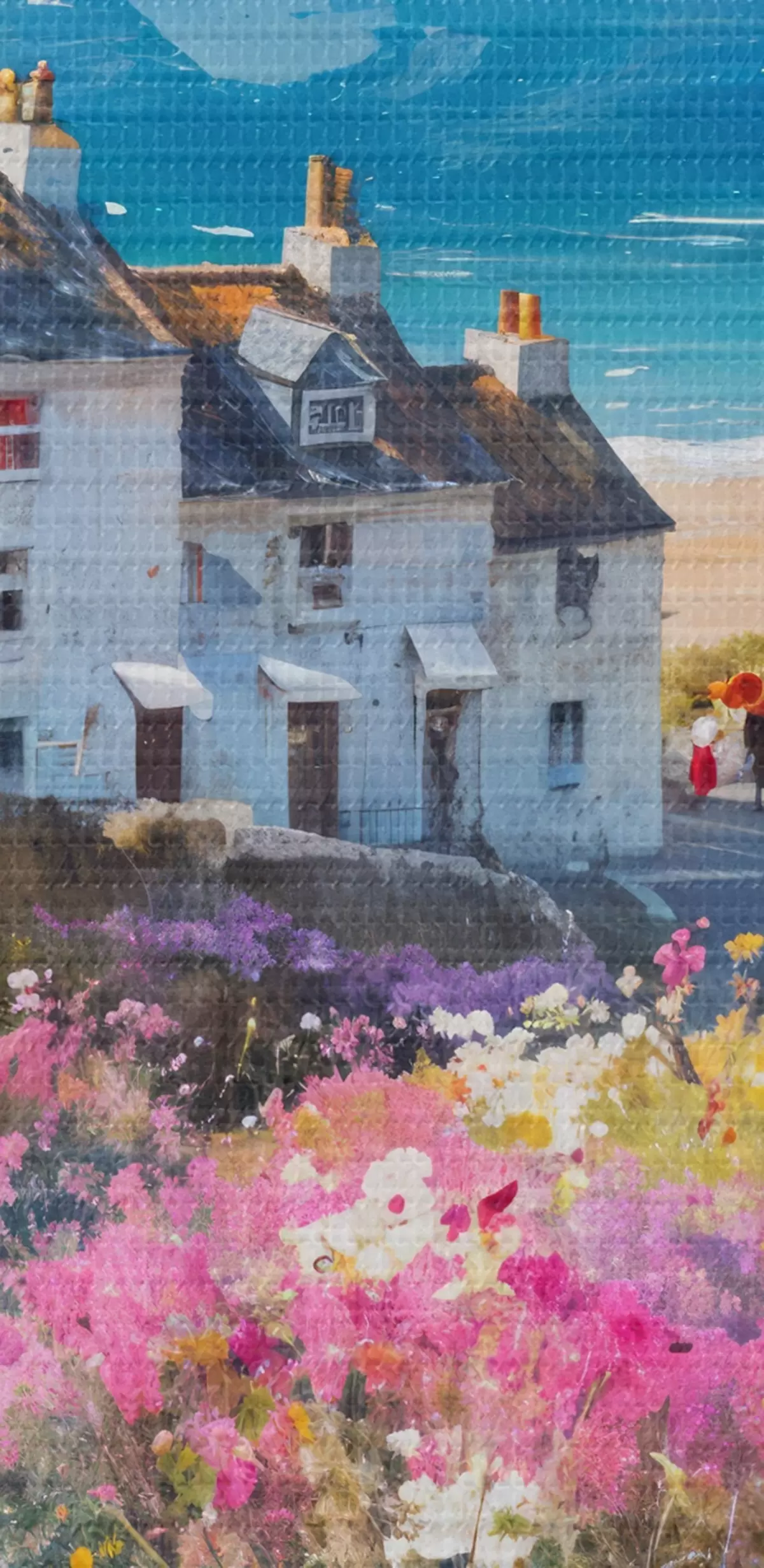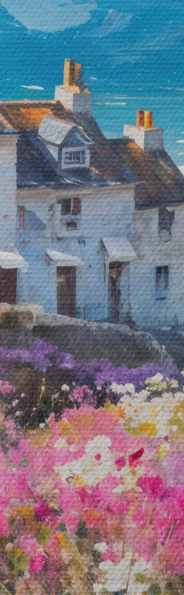 Кругла картина Барвиста картина олією із зображенням приморського містечка з білими будиночками та яскравим квітковим садом на передньому плані r41090