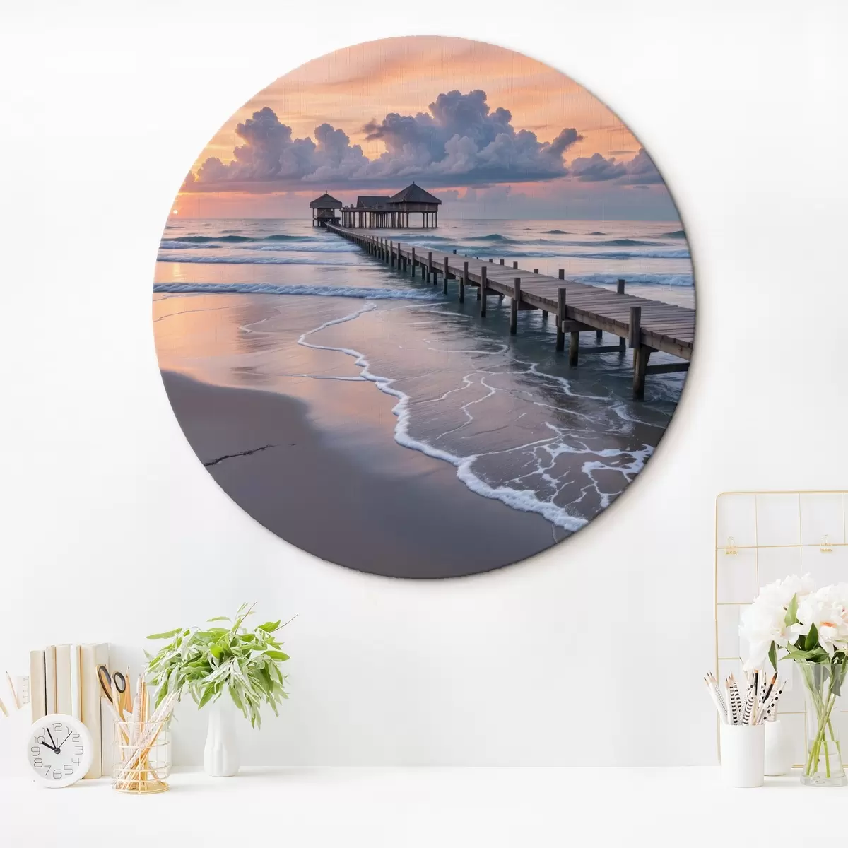 Кругла картина Дерев'яний пірс з видом на спокійний океан на заході сонця з різнокольоровими хмарами r41091
