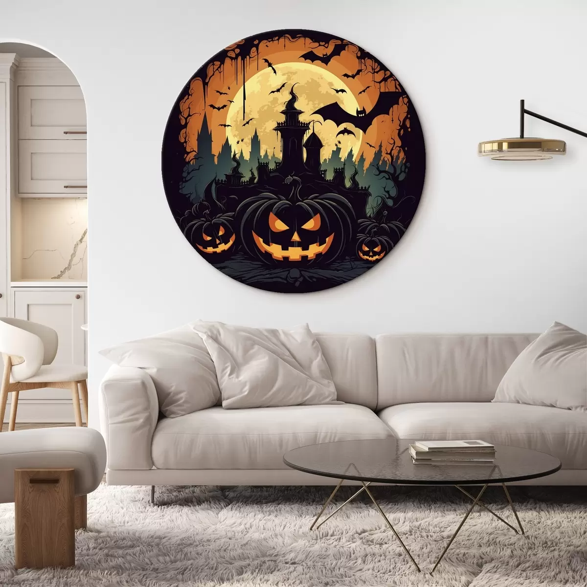 Кругла картина Геловін, замок на тлі повного місяця, кажани та гарбузи Nr r41138