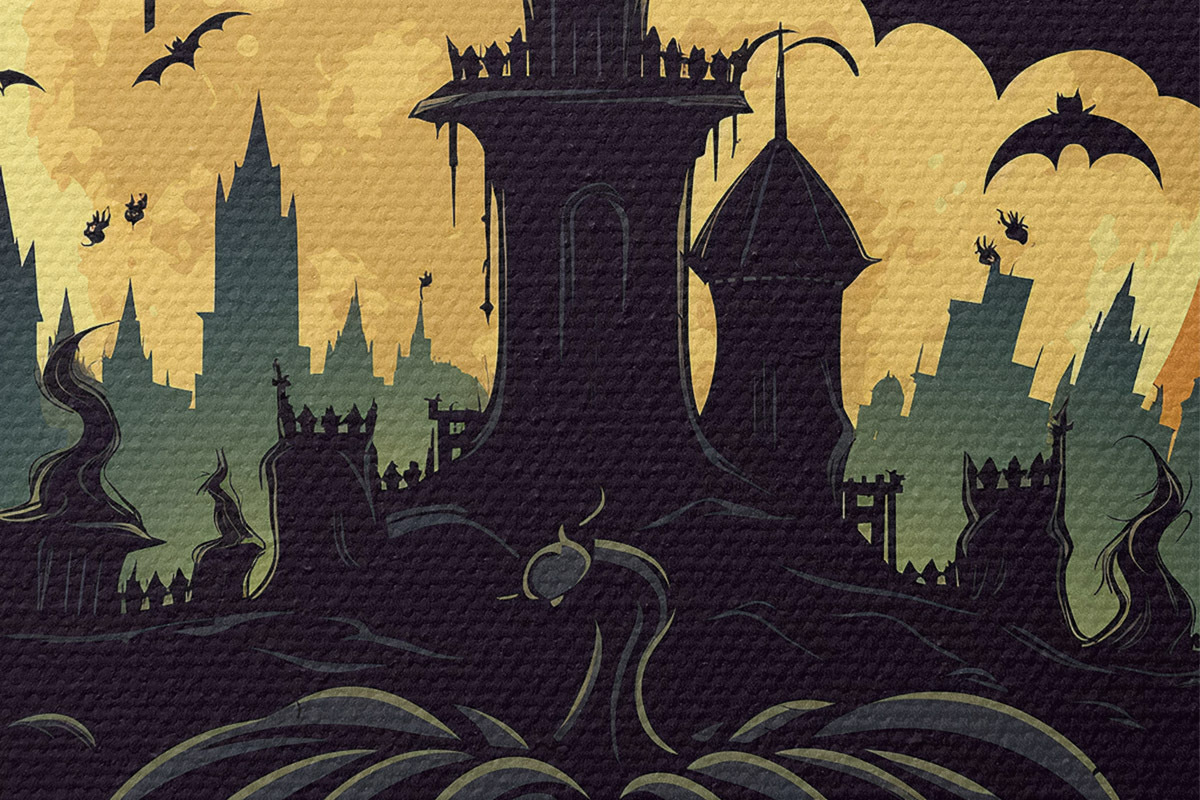 Кругла картина Геловін, замок на тлі повного місяця, кажани та гарбузи r41138