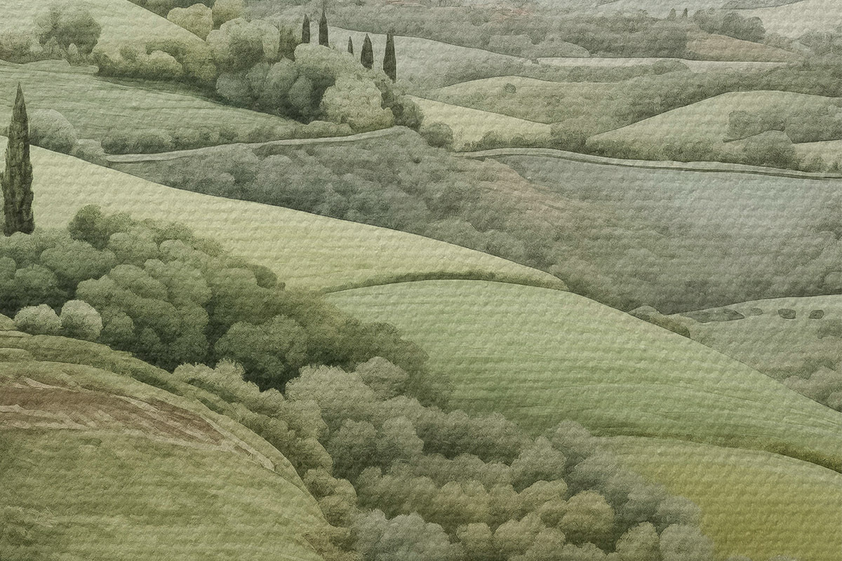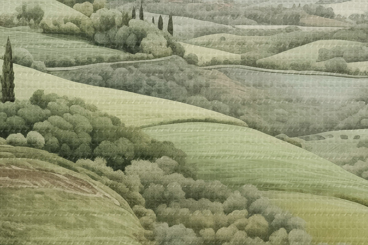 Кругла картина Акварельні пейзажі з деревами та горами, Тоскана, літо r41222
