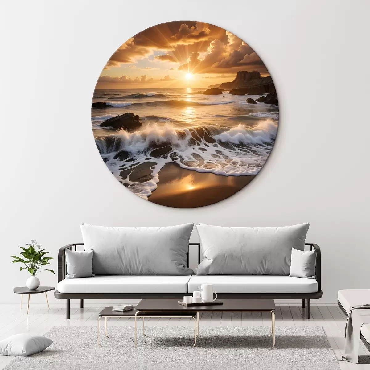 Кругла картина Драматичний захід сонця над скелястим узбережжям, з розкотистими хвилями і драматичними хмарами в небі Nr r41245