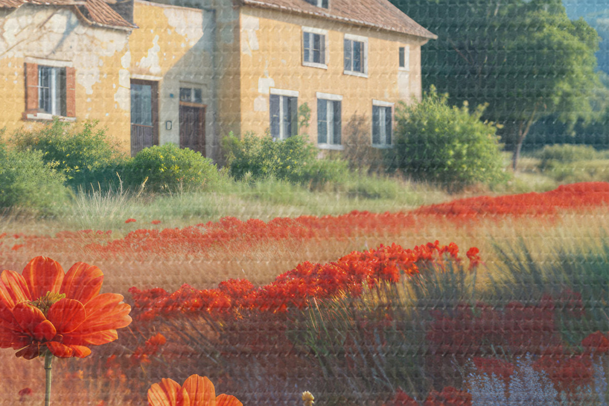 Кругла картина Поле яскравих червоних маків на передньому плані, з низкою чарівних жовто-білих будиночків на задньому плані Nr r41260