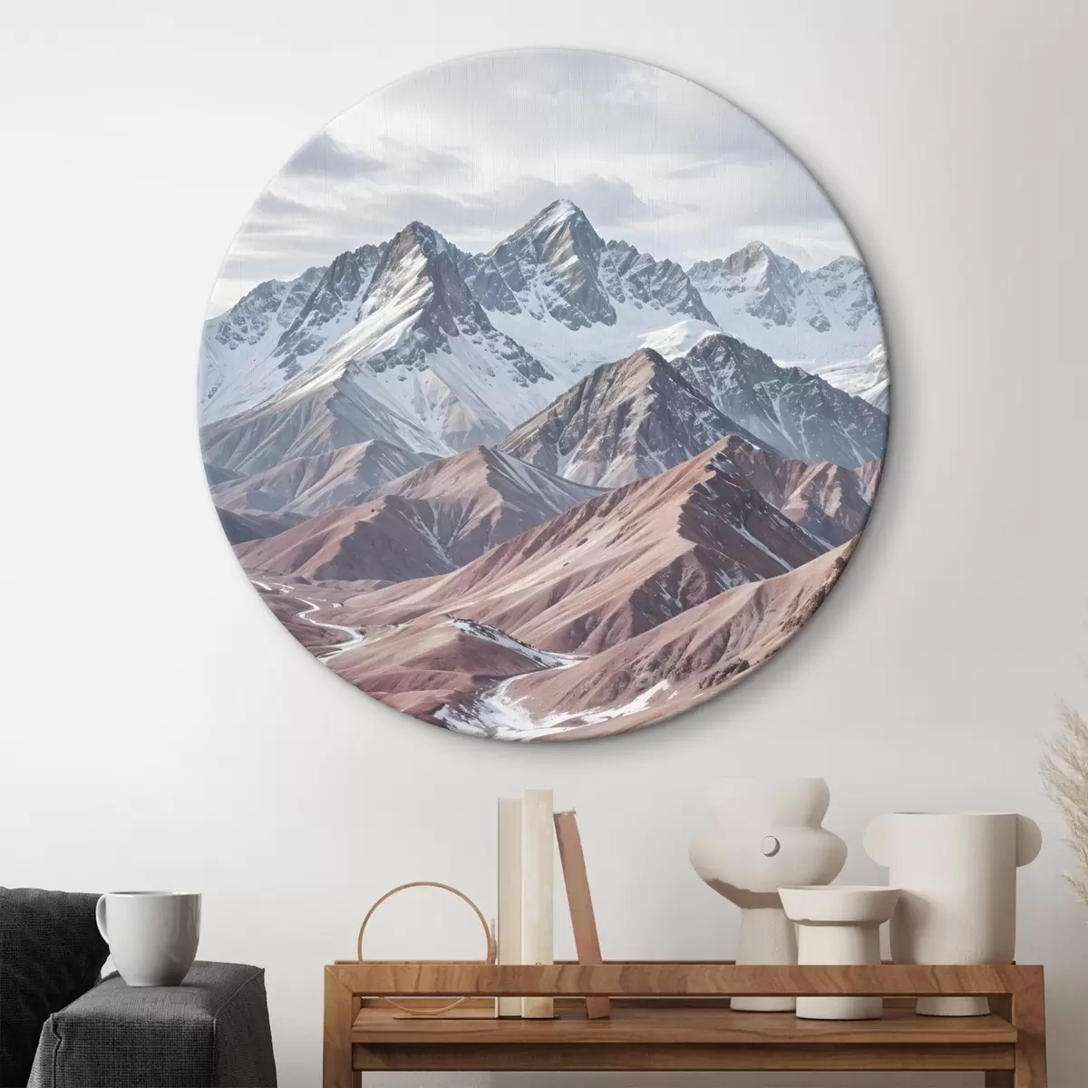 Кругла картина Суворі, засніжені гори зі звивистою річкою, що протікає через величезний, барвистий ландшафт Nr r41262
