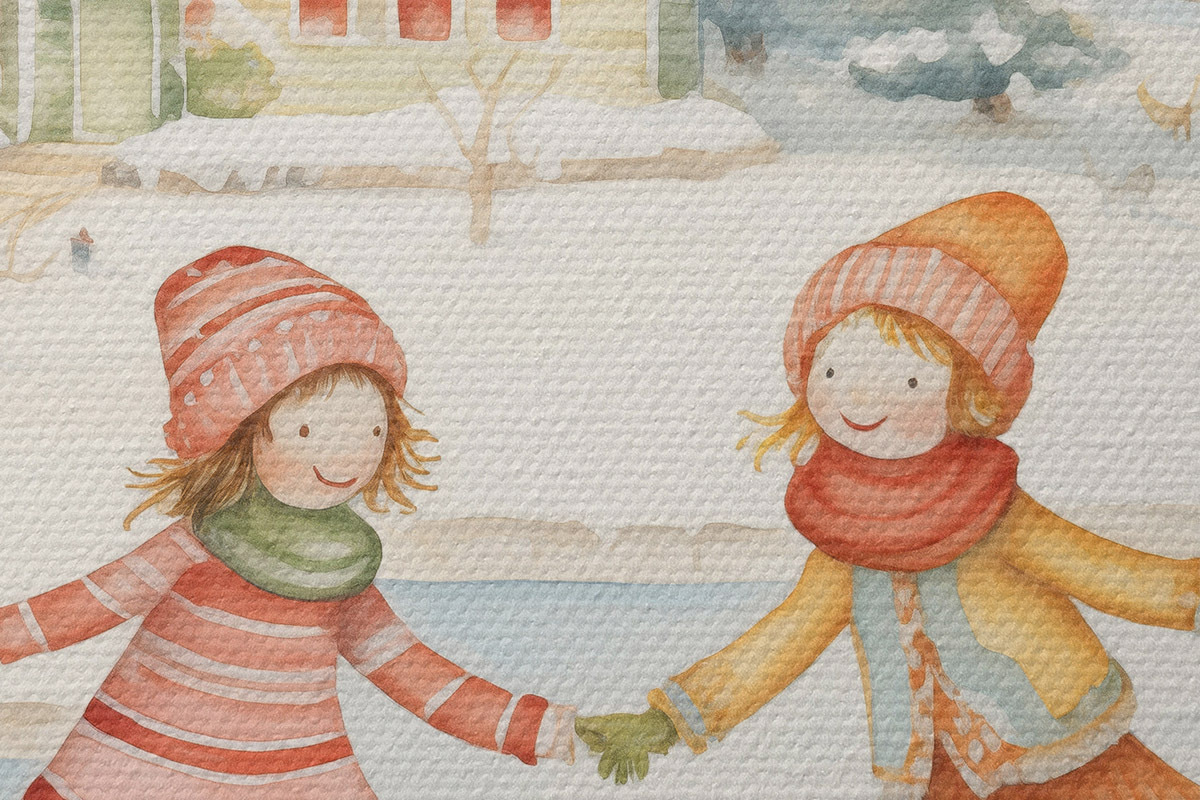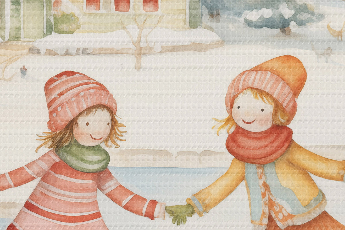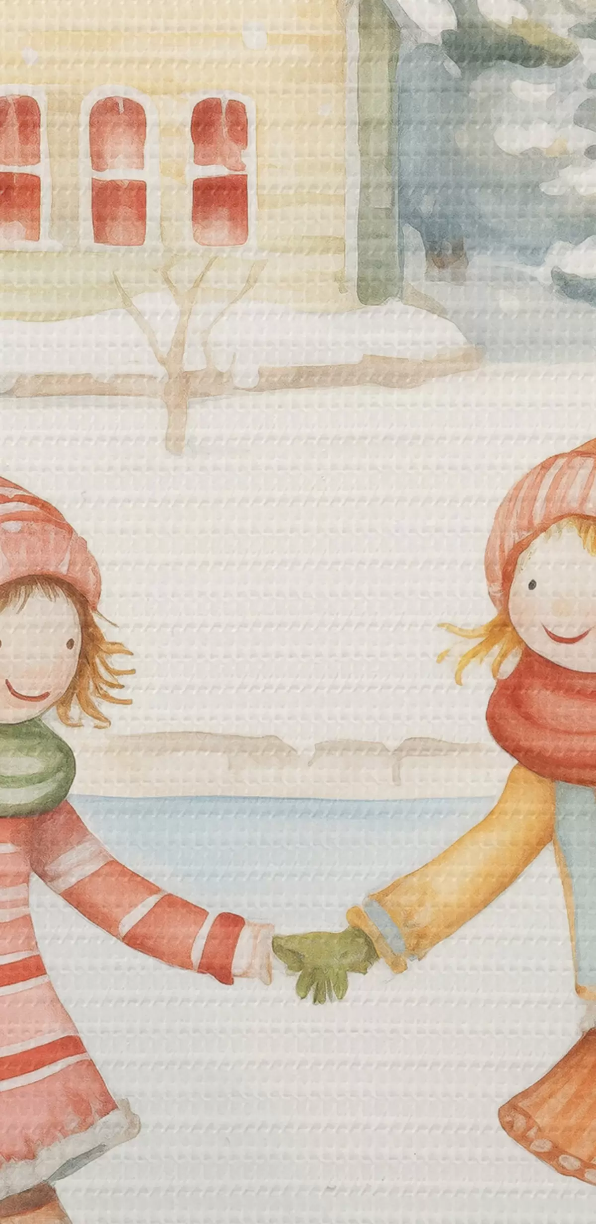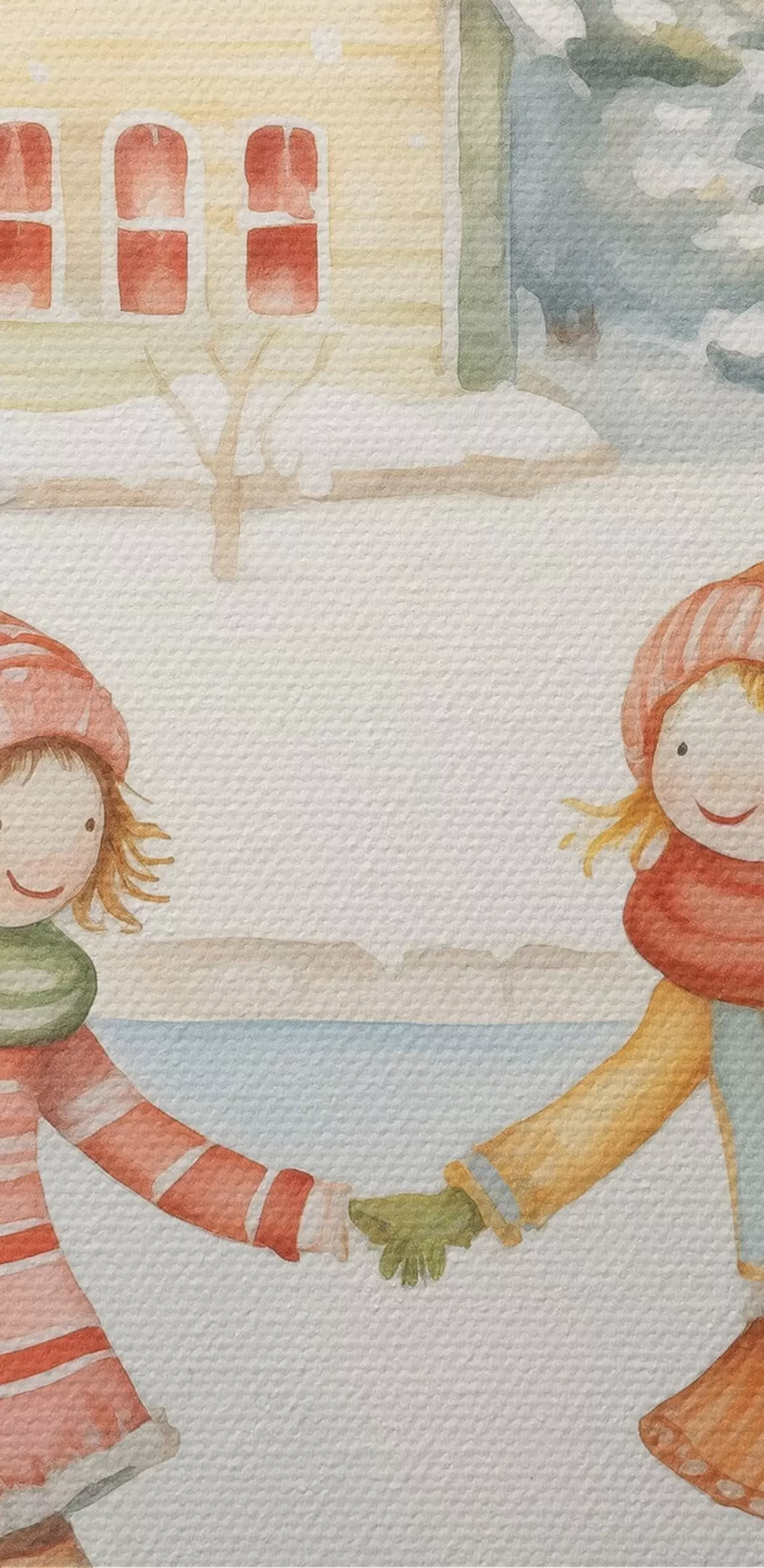 Кругла картина Зимова сцена з двома дівчатами на ковзанах, зимове місто, будинки, ліс Nr r41377