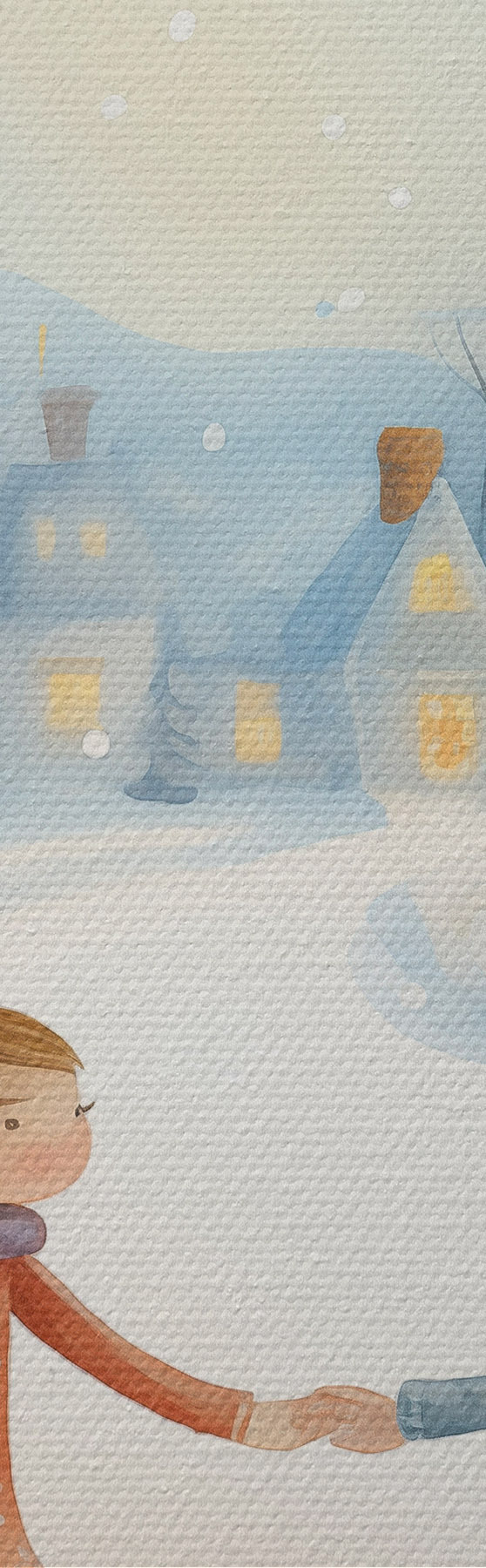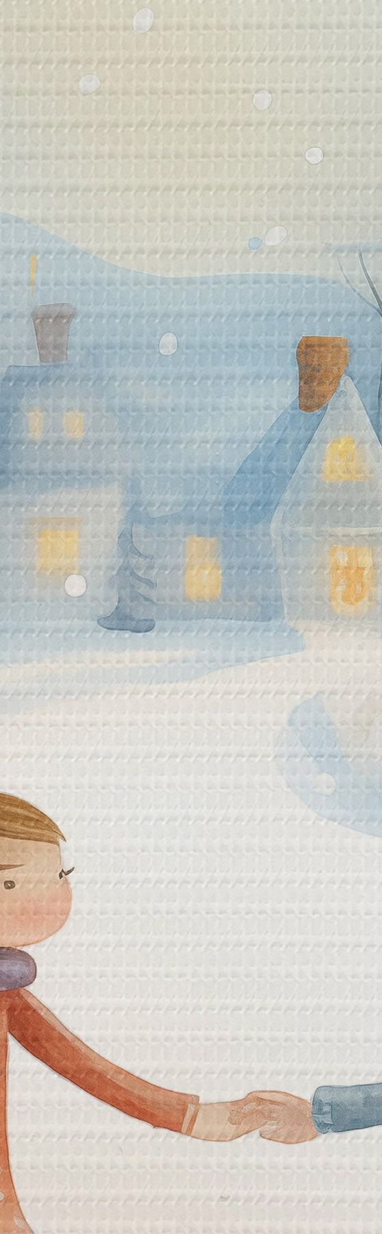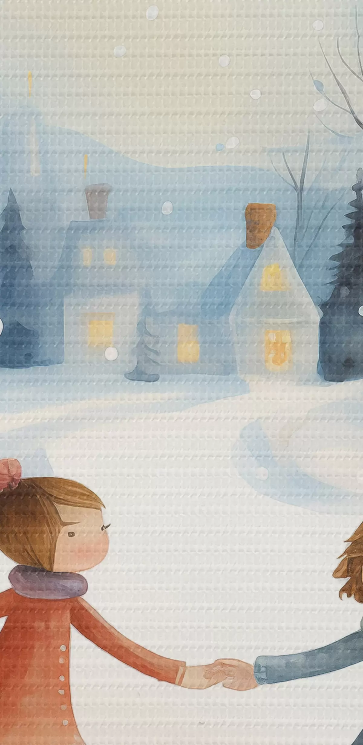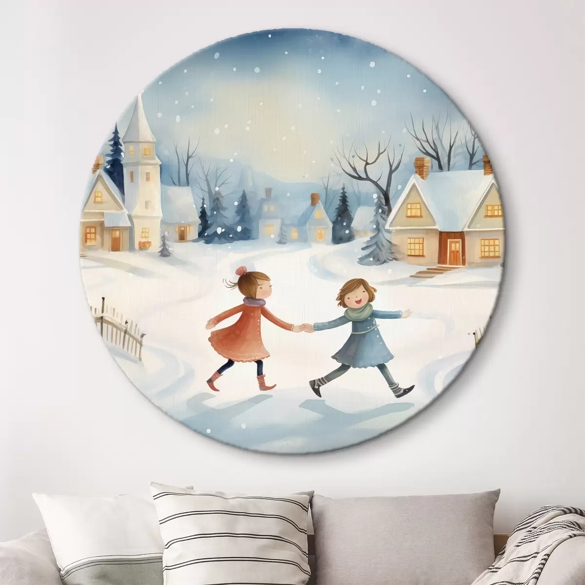 Кругла картина Дівчата в зимовому селі, сніжинки, акварель, будинки, ліс Nr r41385