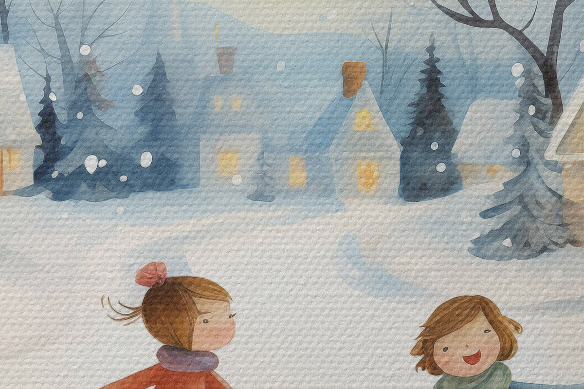 Кругла картина Дівчата в зимовому селі, сніжинки, акварель, будинки, ліс r41385