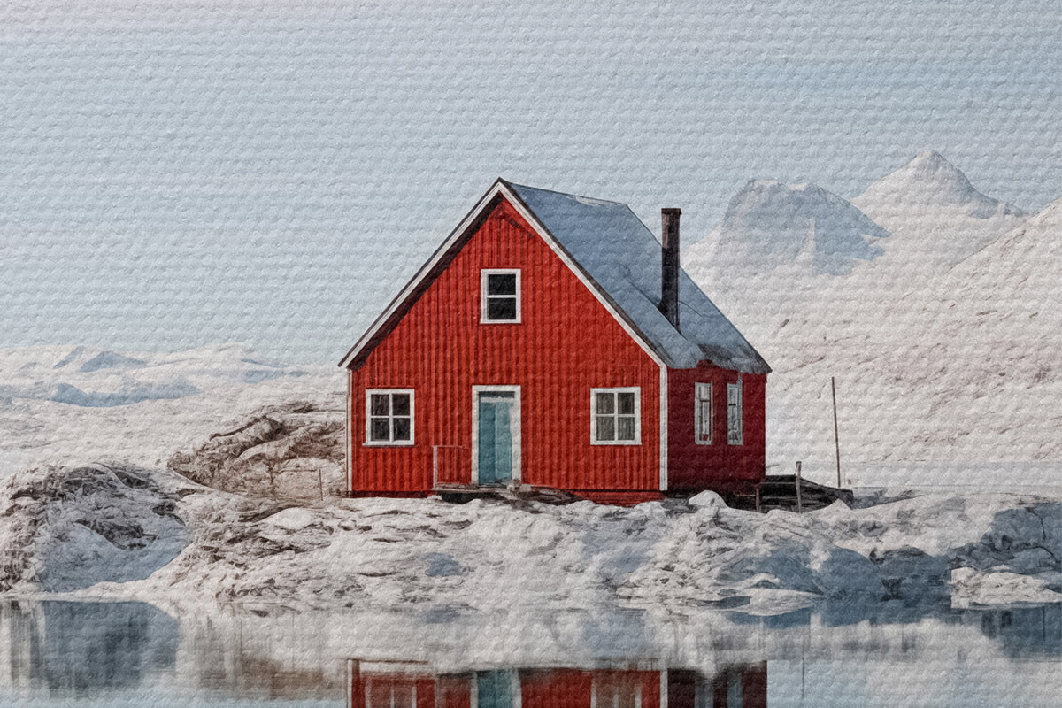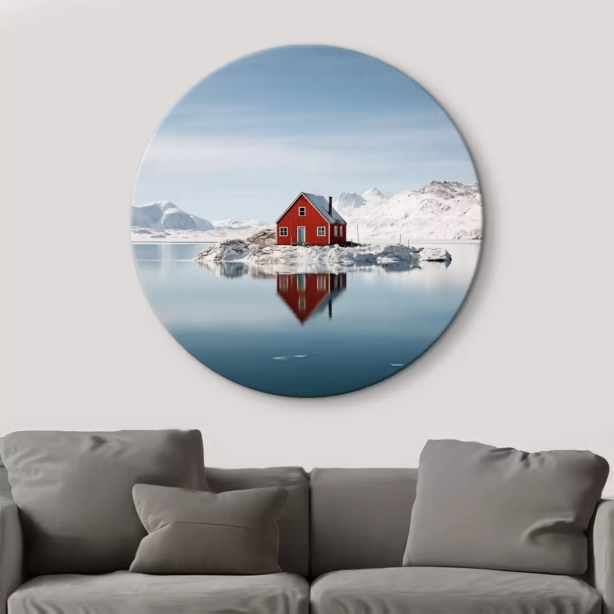 Кругла картина Мінімалістичний зимовий пейзаж червоний будинок біля озера Nr r41437
