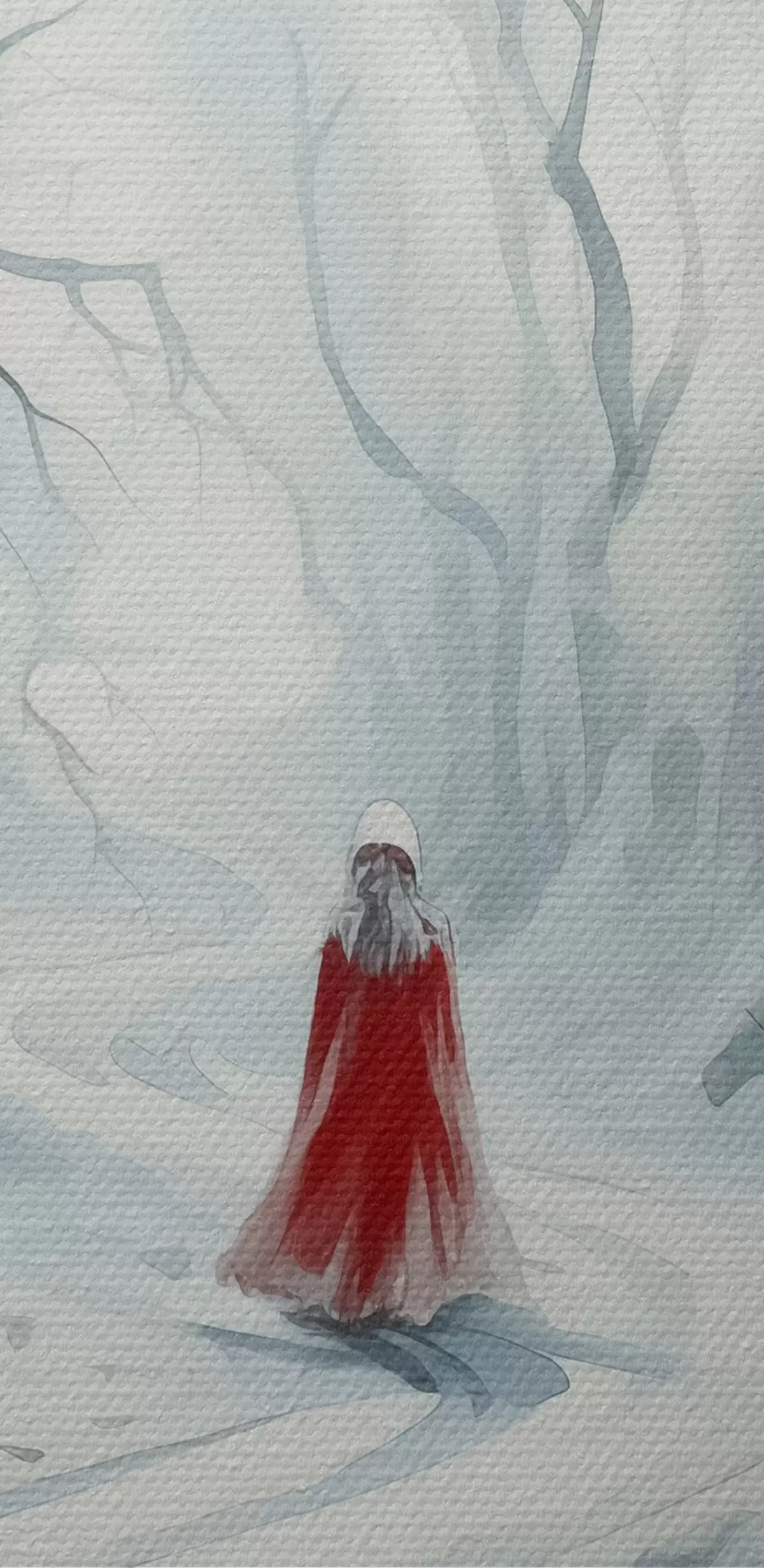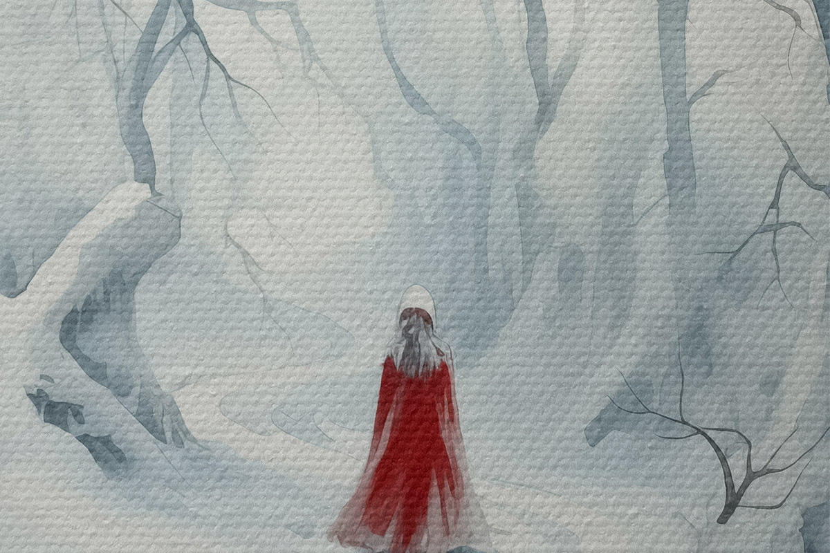 Кругла картина Чоловік у червоному пальто посеред зимового лісу Nr r41438