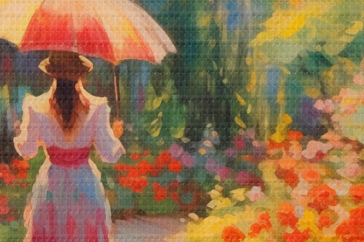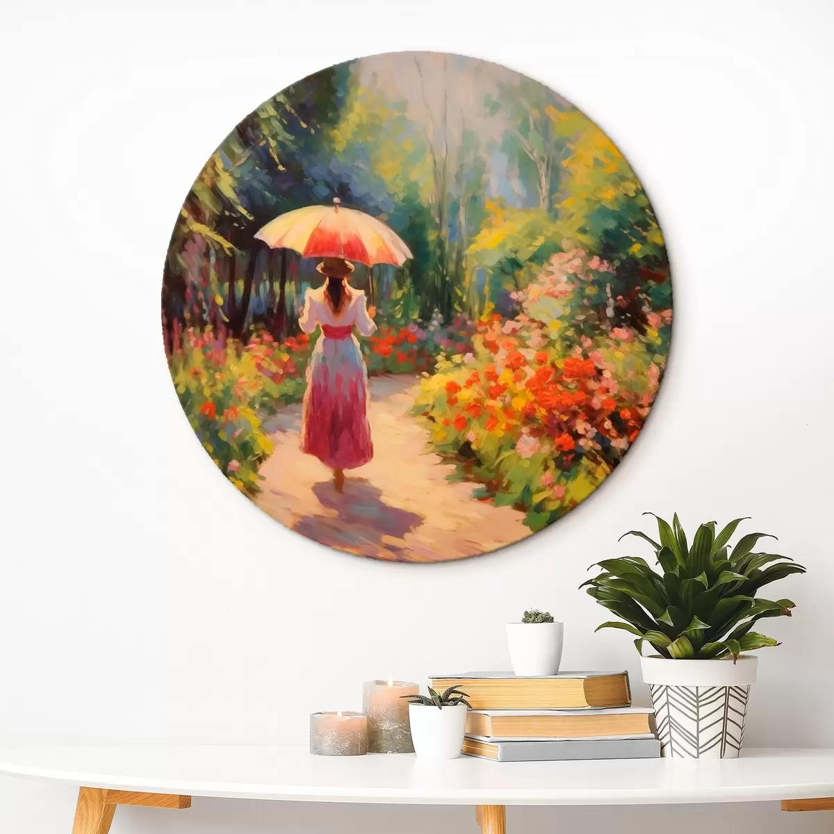 Кругла картина Жінка з парасолькою в квітучому саду Nr r41495