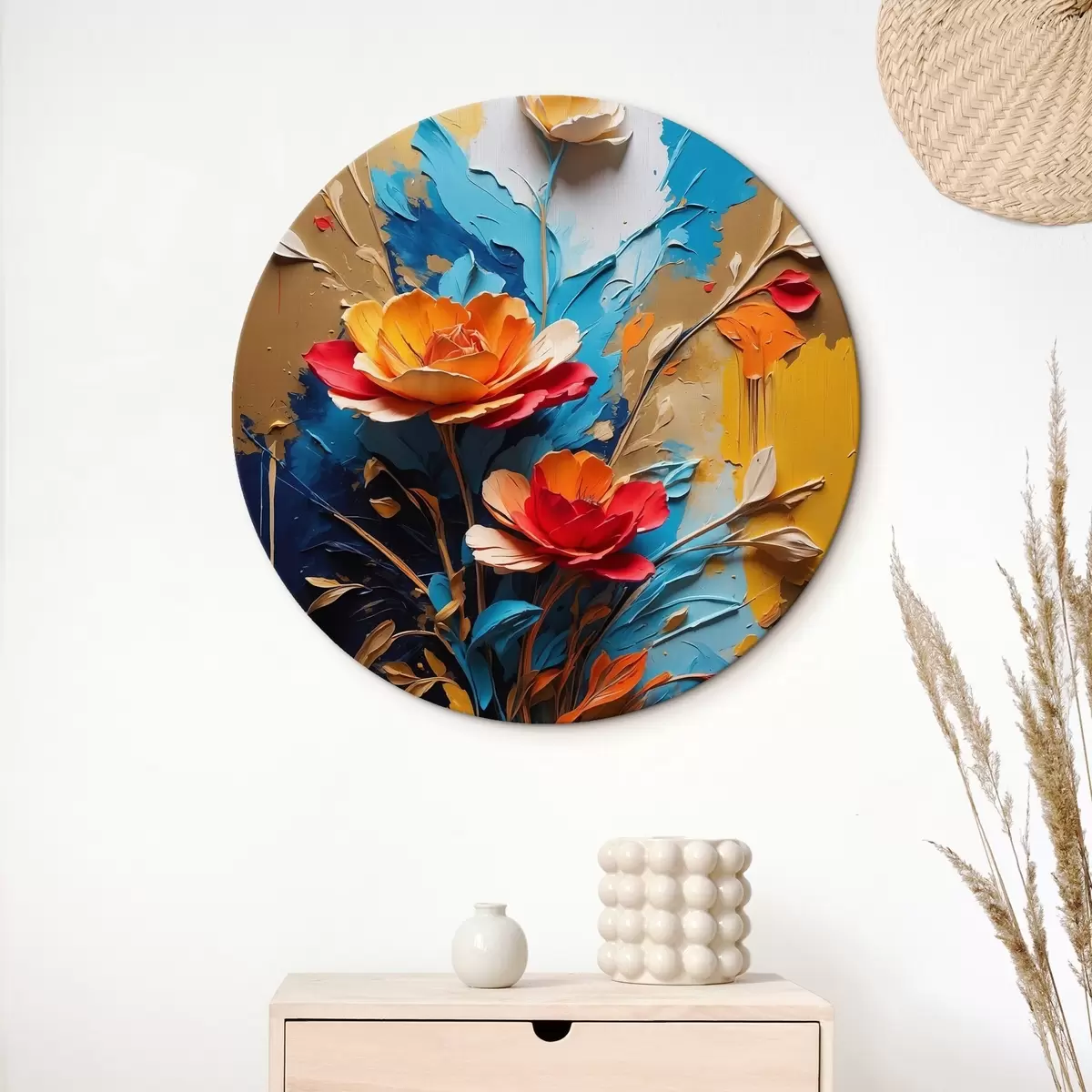 Кругла картина Квіти на абстрактному різнобарвному тлі в стилі олійного живопису Nr r41769