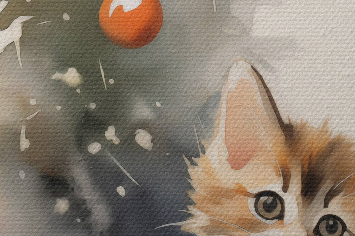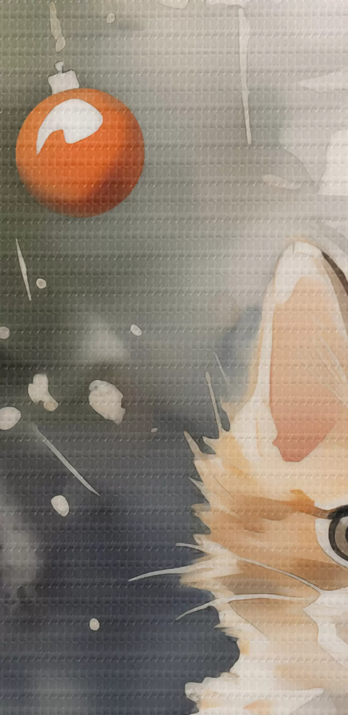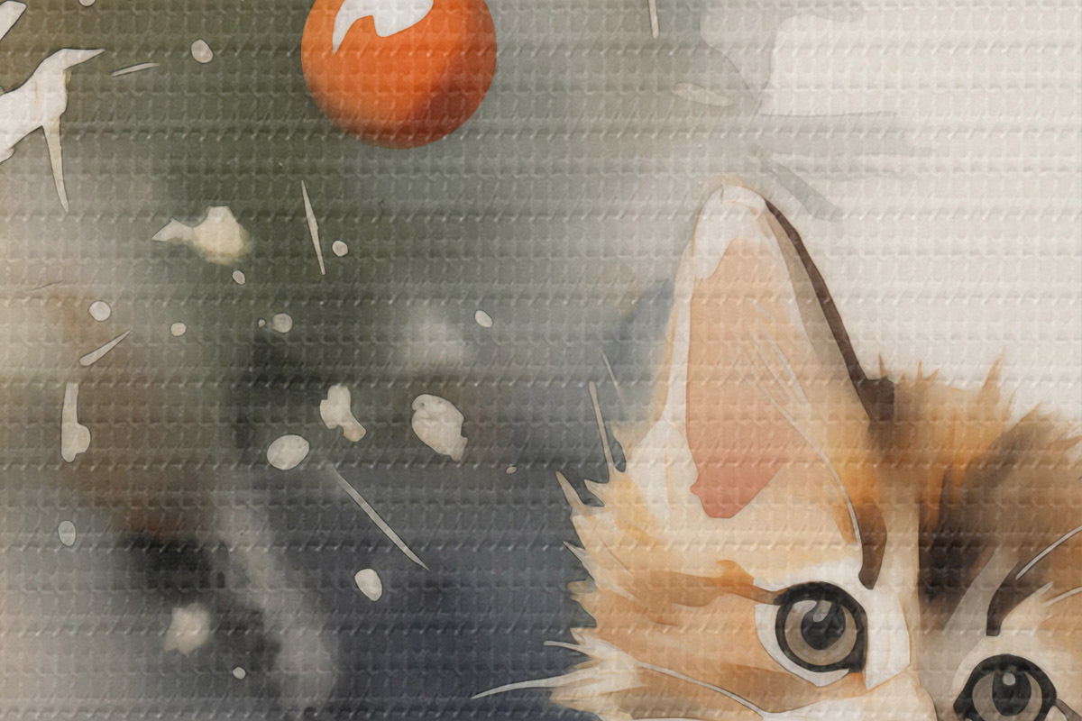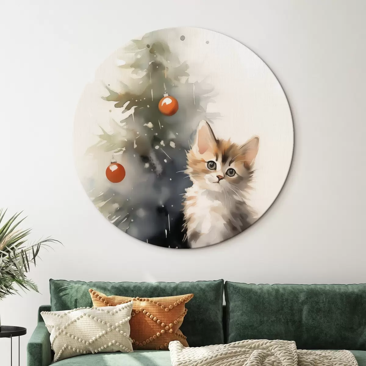 Кругла картина Кошеня біля ялинки, імітація мокрої акварелі r42140