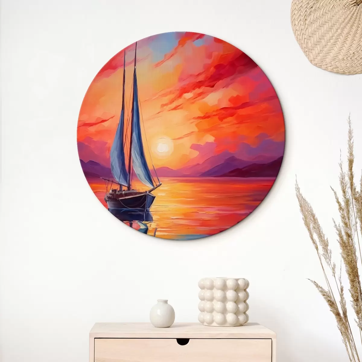 Кругла картина Вітрильник на тлі яскравого заходу сонця Nr r42151