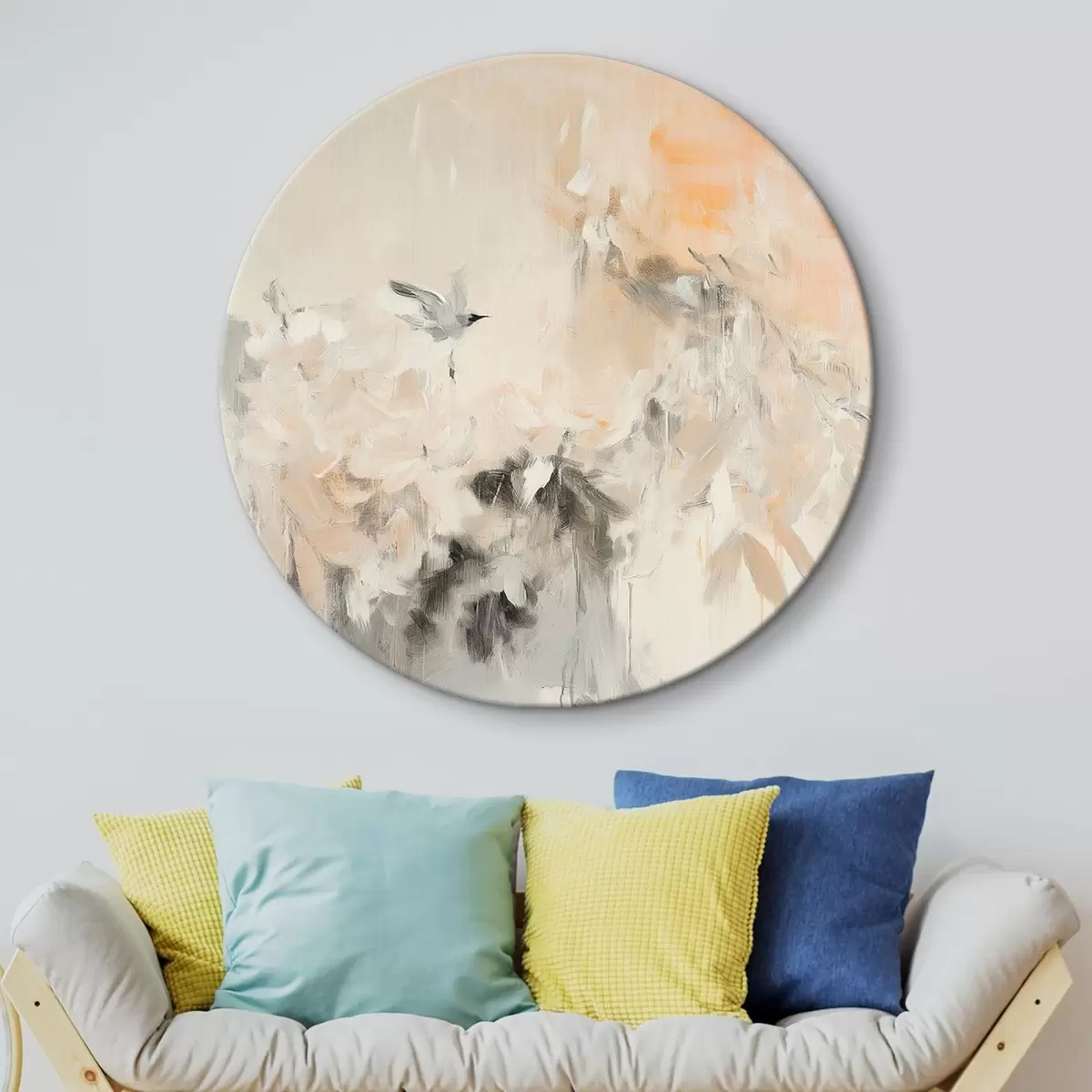 Кругла картина Абстракція з птахами, що летять, акриловий стиль, рожевий та бежевий кольори Nr r42205