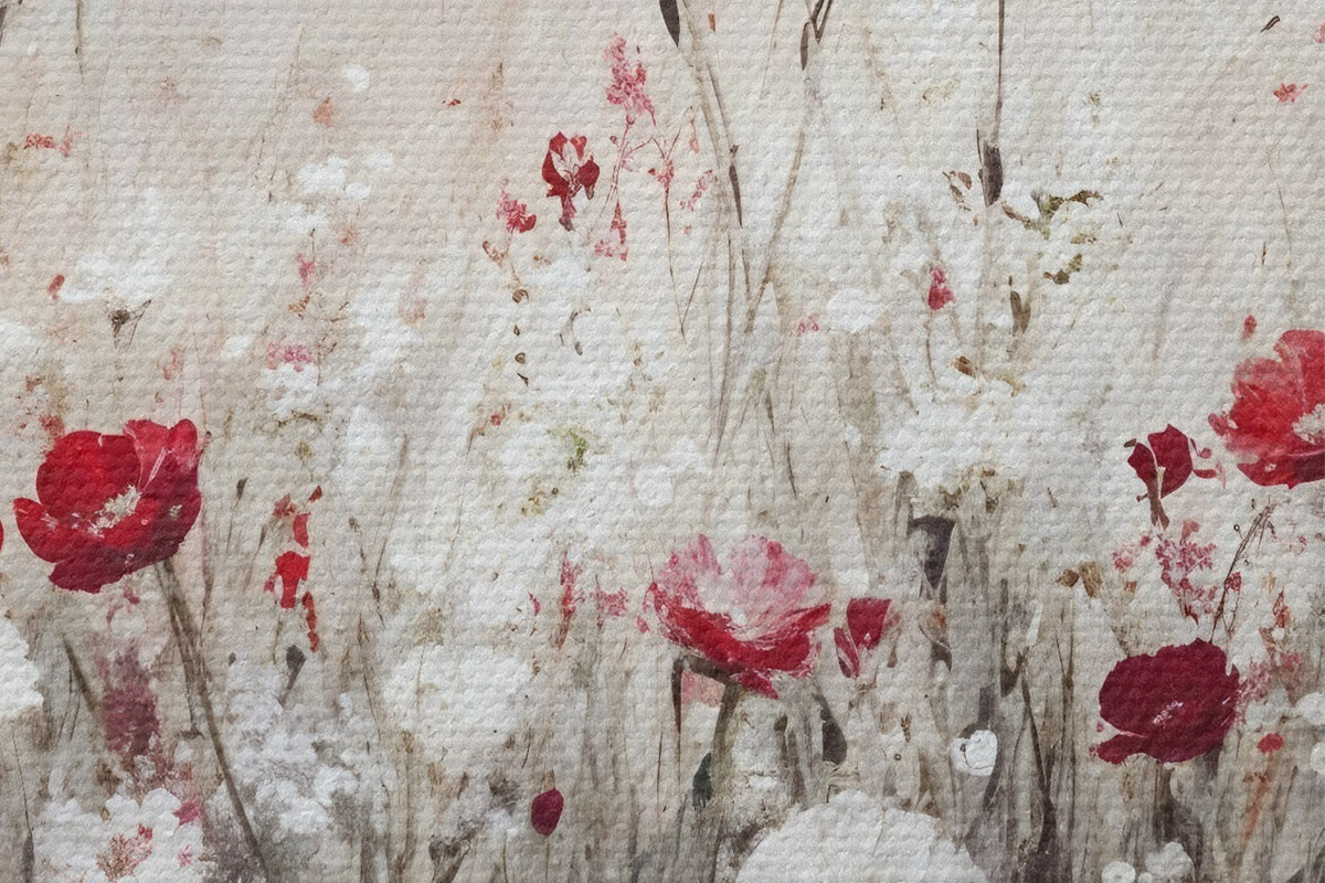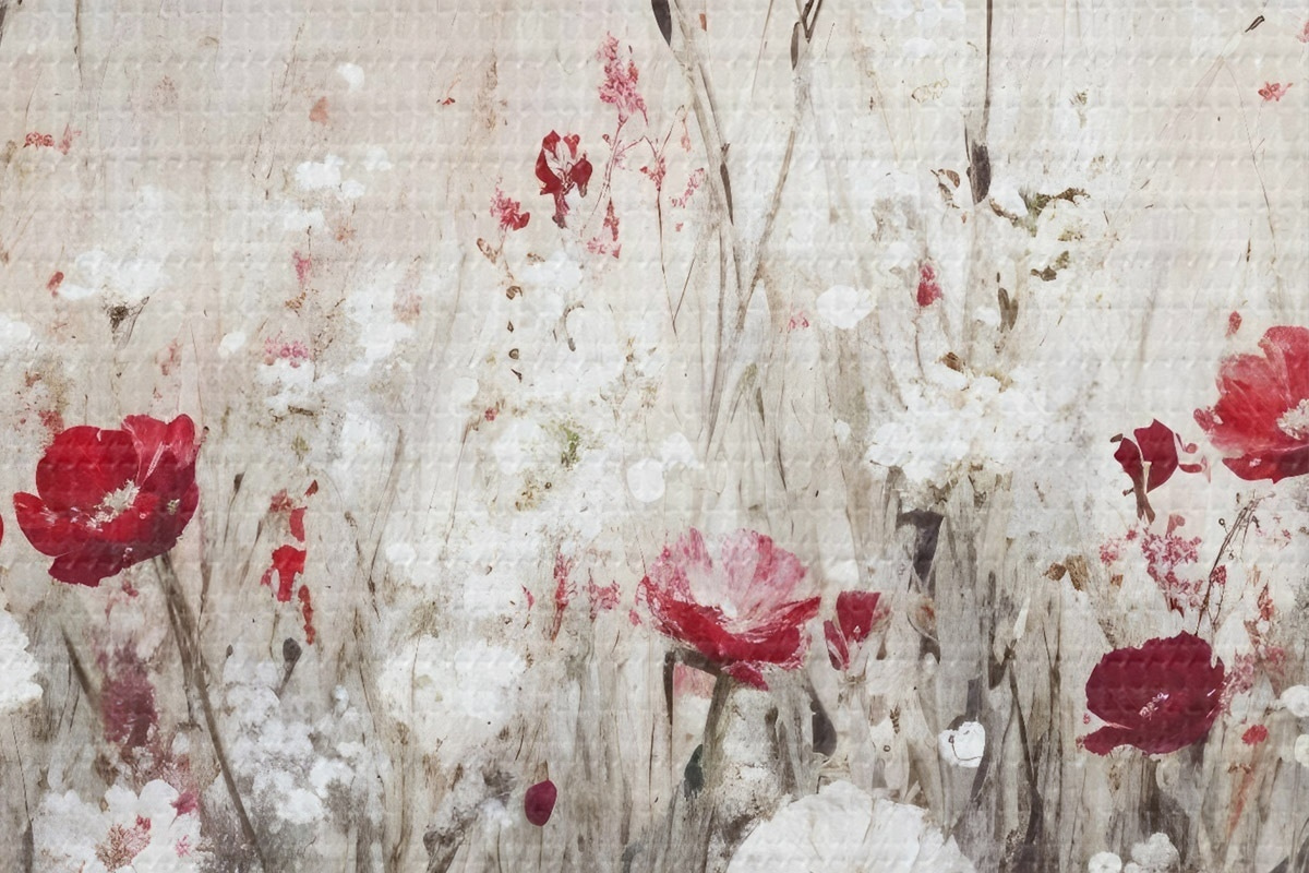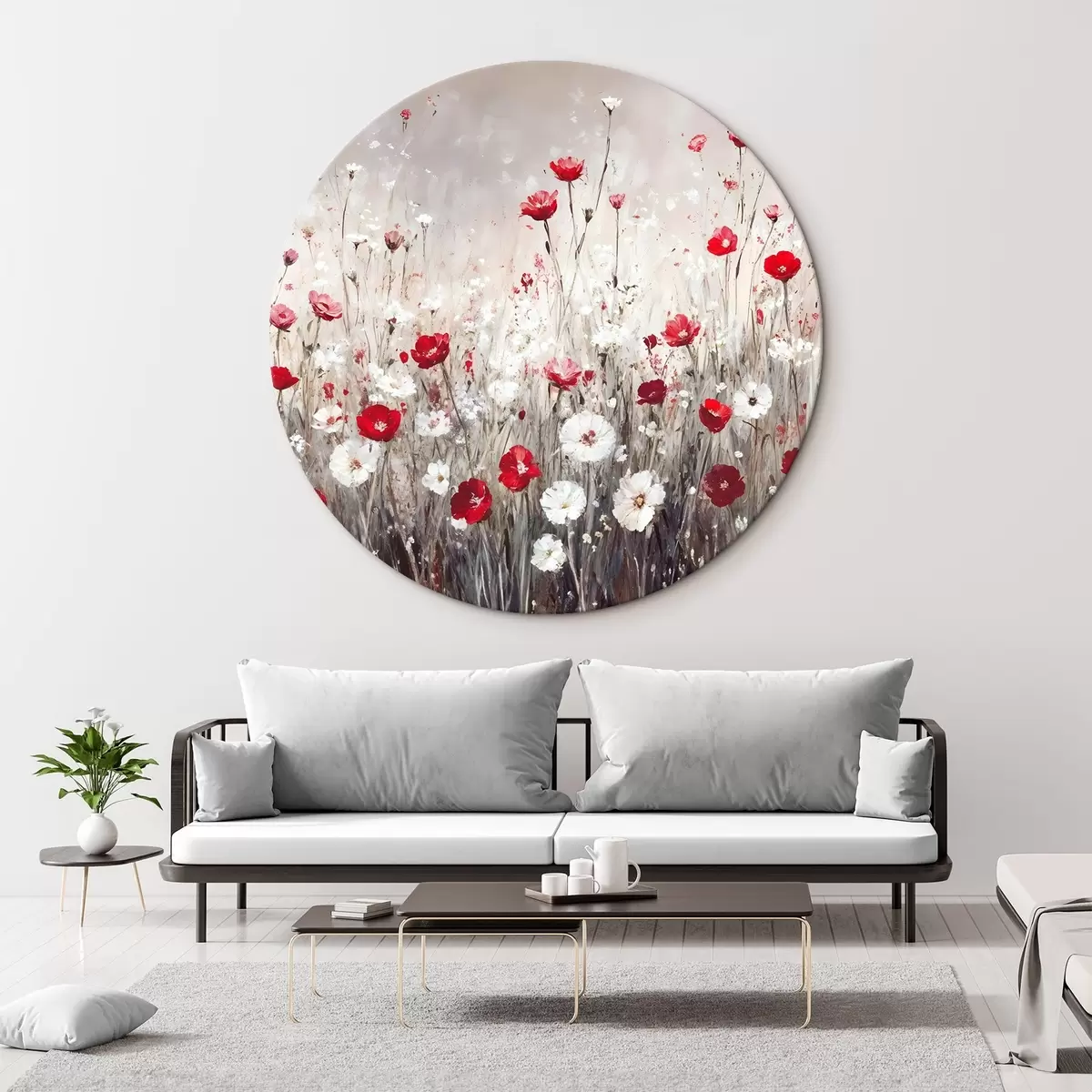 Кругла картина Абстрактна імітація олійного живопису поля червоних і білих маків та ромашок на сірому фактурному тлі Nr r42213