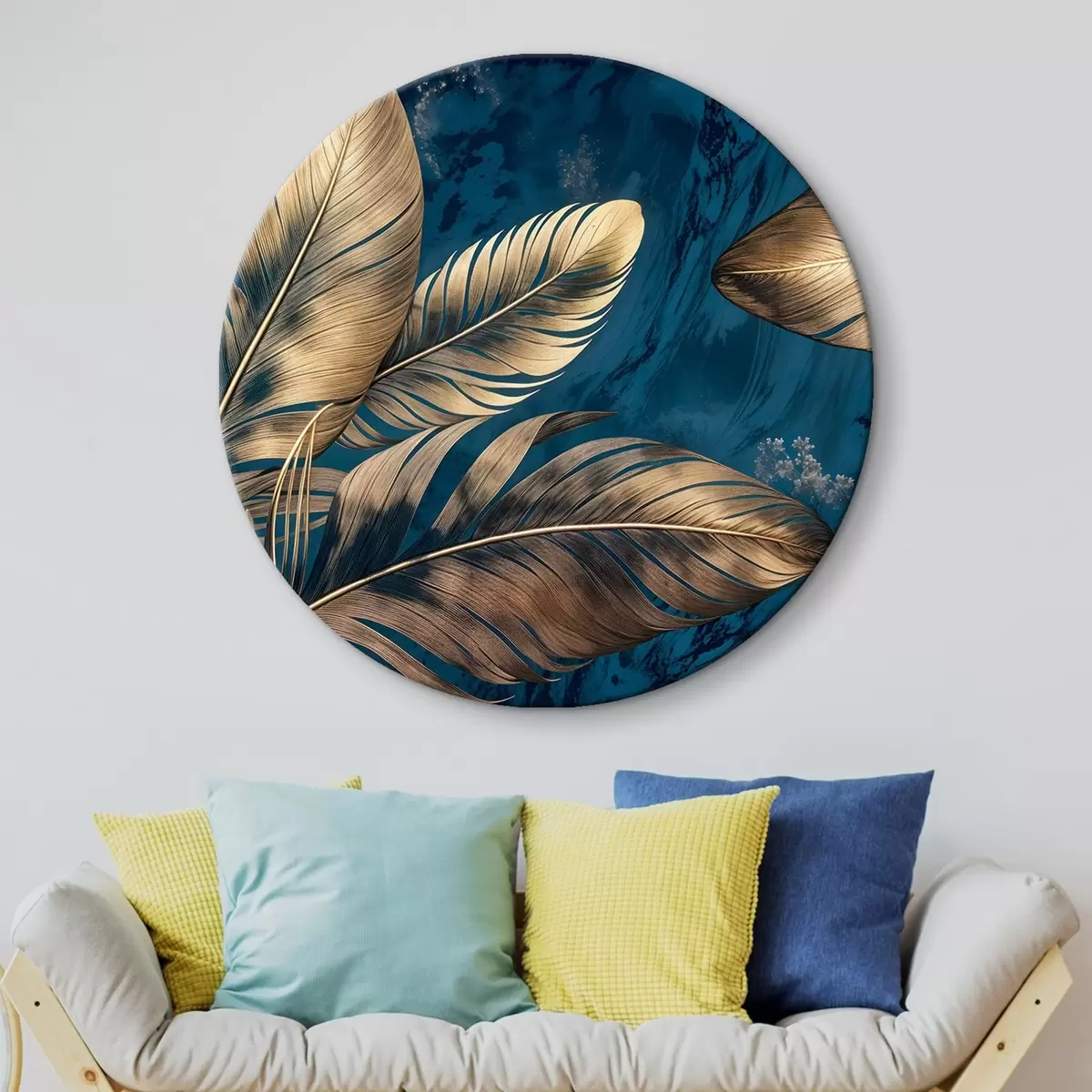 Кругла картина Жовте та бежеве абстрактне декоративне пір'я, що плаває на темно-синьому текстурному тлі r42218
