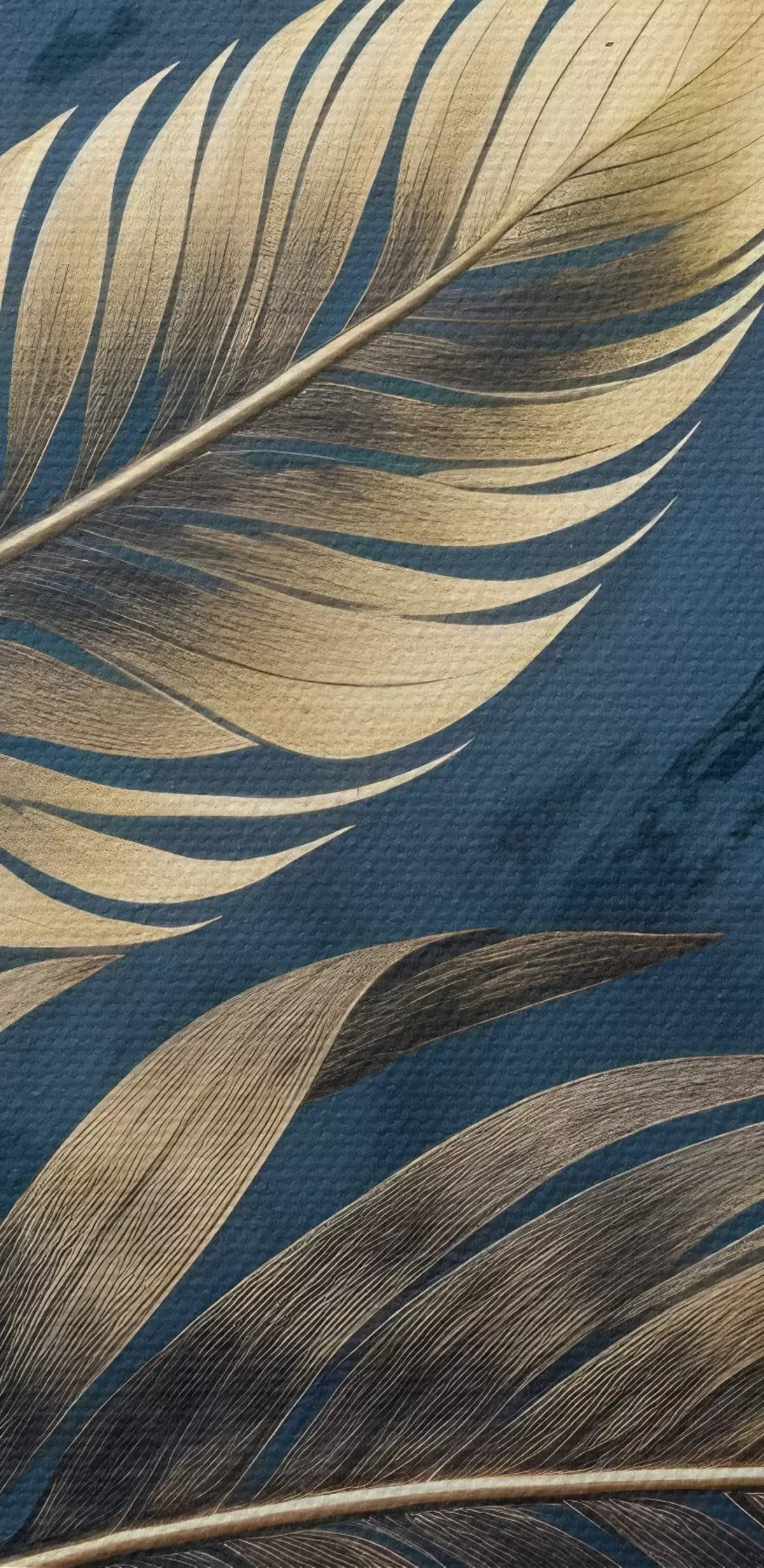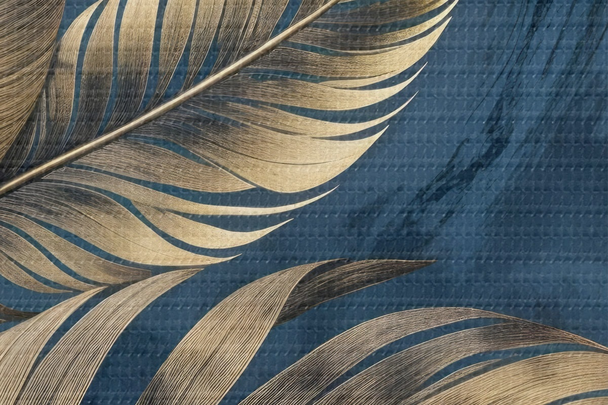 Кругла картина Жовте та бежеве абстрактне декоративне пір'я, що плаває на темно-синьому текстурному тлі Nr r42218