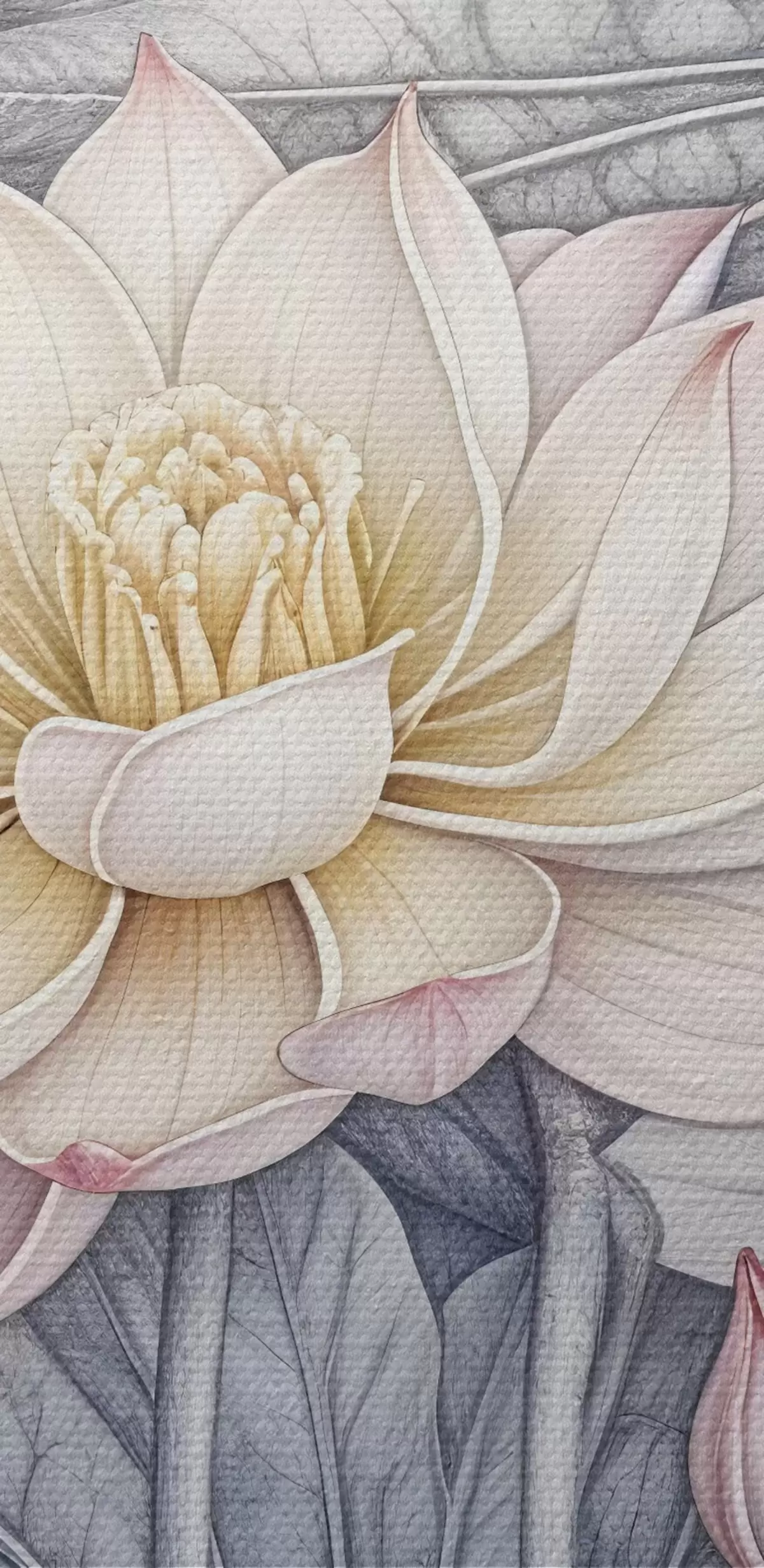 Кругла картина Великі рожеві та білі квіти лотоса з зеленим листям і стеблами на світлому тлі з деталізованими пелюстками та серединками Nr r42221