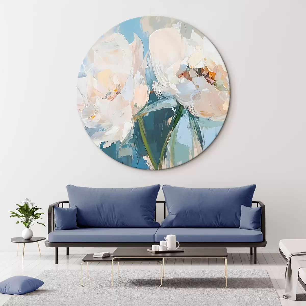 Кругла картина Білі мінімалістичні абстрактні півонії з імітацією олійного живопису на ніжно-блакитному тлі Nr r42226