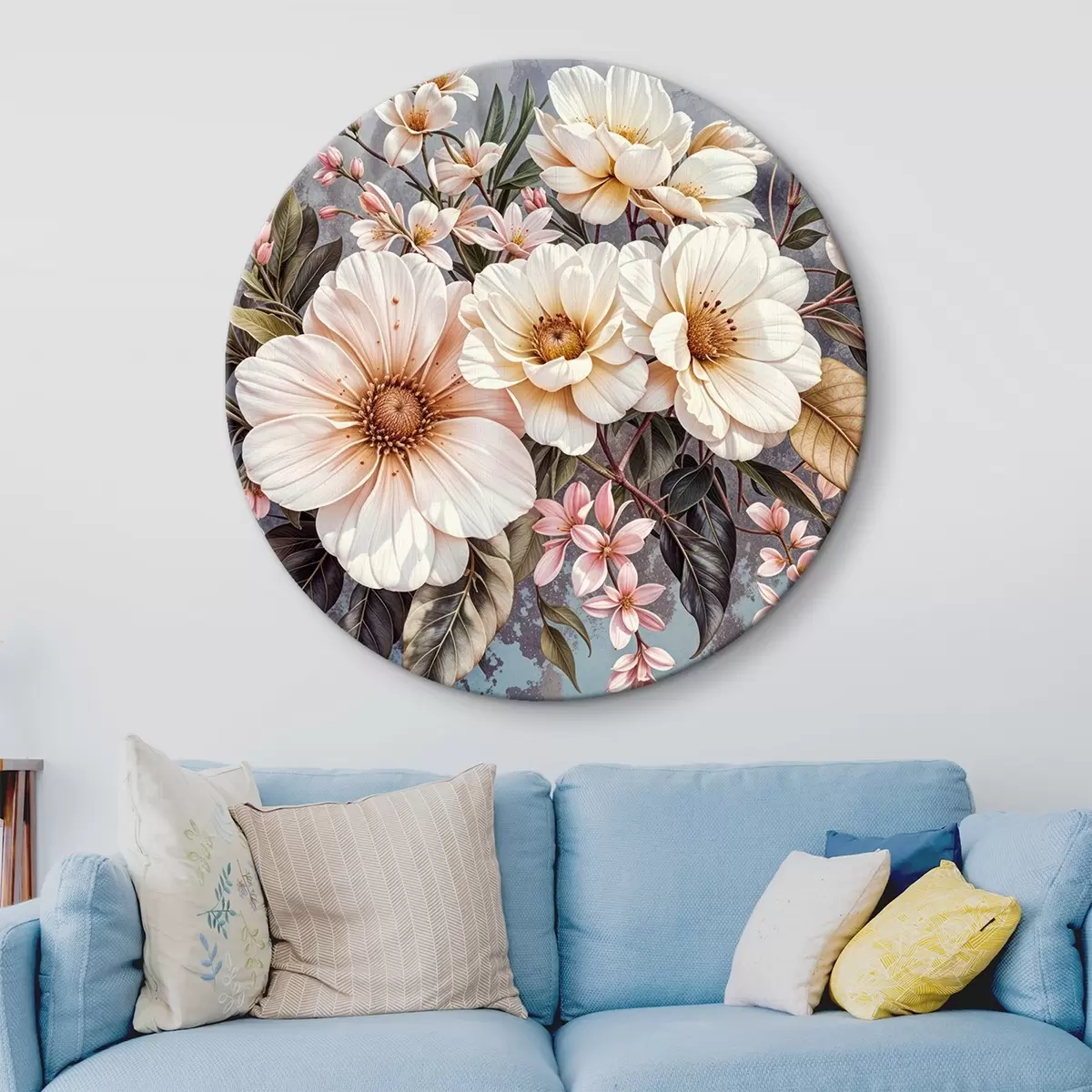 Кругла картина Яскравий букет з великих деталізованих білих і рожевих квіток жоржин із зеленим листям на темному тлі Nr r42227