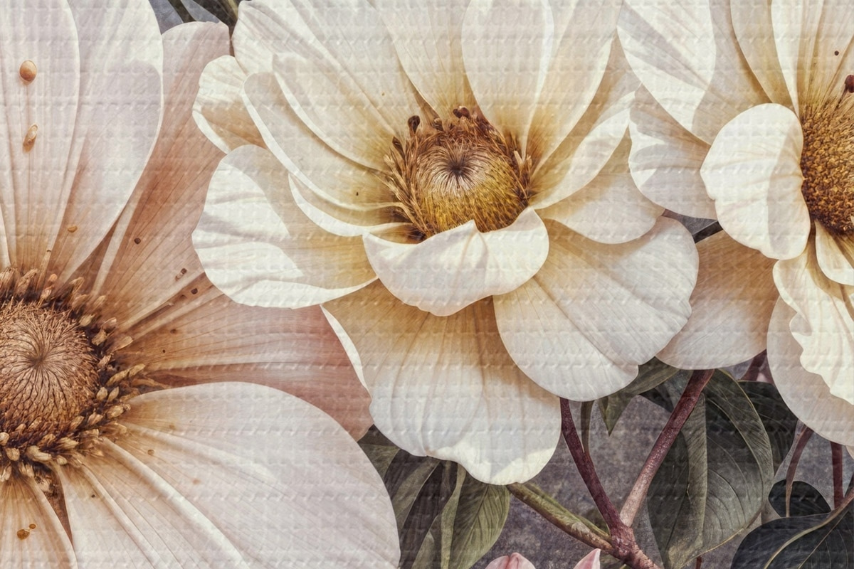 Кругла картина Яскравий букет з великих деталізованих білих і рожевих квіток жоржин із зеленим листям на темному тлі r42227