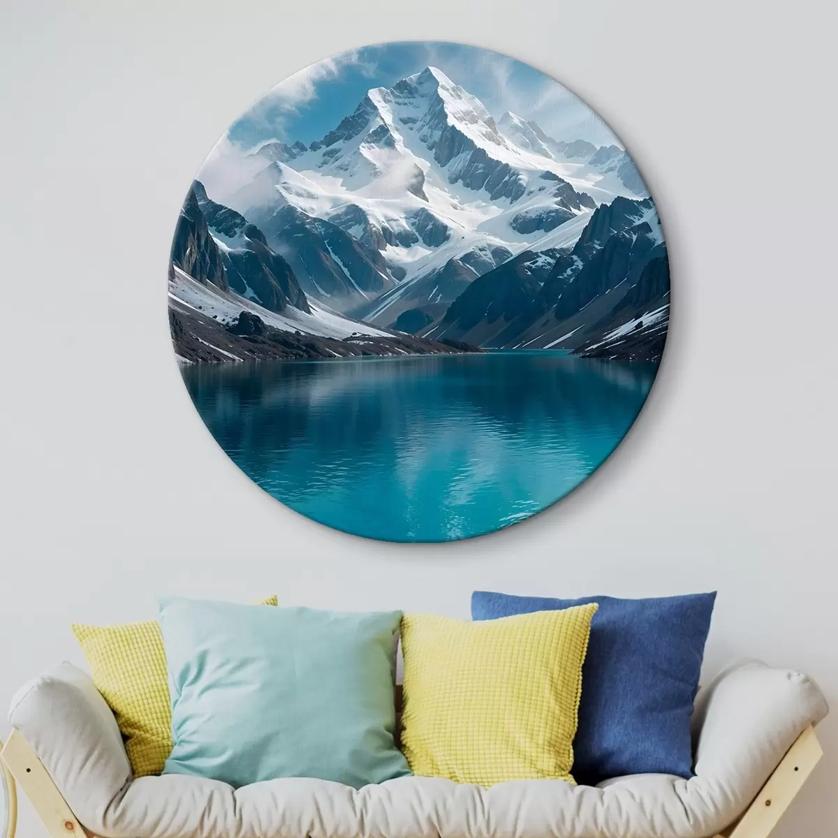 Кругла картина Засніжена гірська вершина, що відбивається в безтурботному бірюзовому озері, оточена скелястою місцевістю і драматичними хмарами Nr r42232