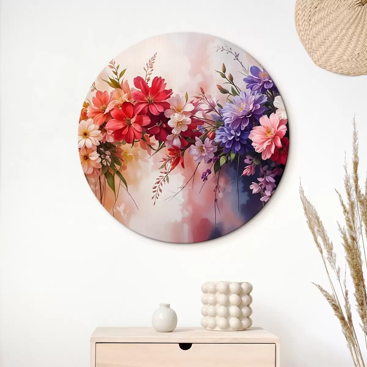 Кругла картина Барвисті квіти, включаючи червоні, рожеві та фіолетові жоржини, маргаритки та інші квіти на м'якому, розмитому тлі Nr r42234