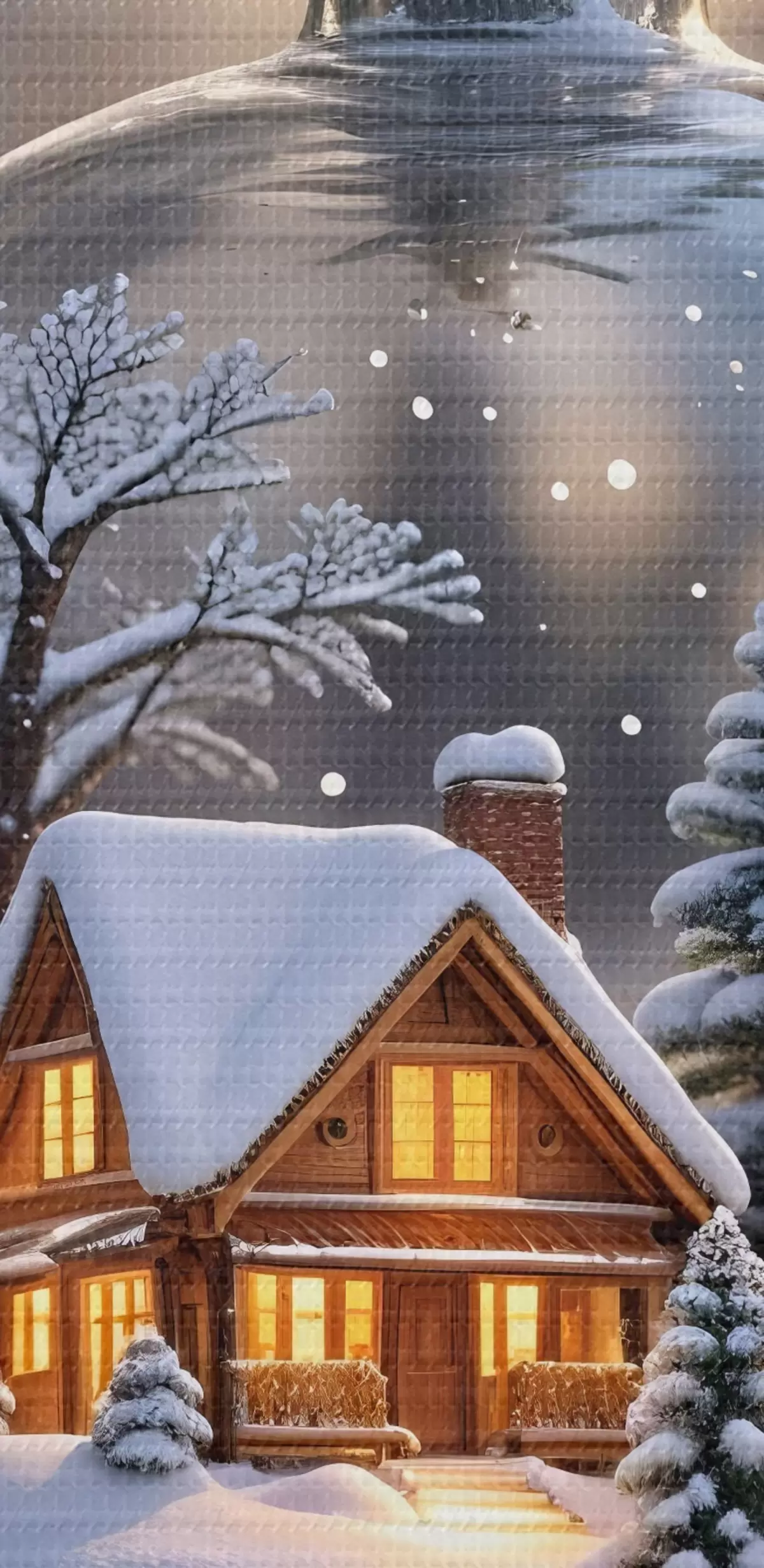 Кругла картина Скляна різдвяна куля із засніженим зимовим пейзажем всередині, на якому зображено затишну хатинку в лісі з соснами Nr r42236