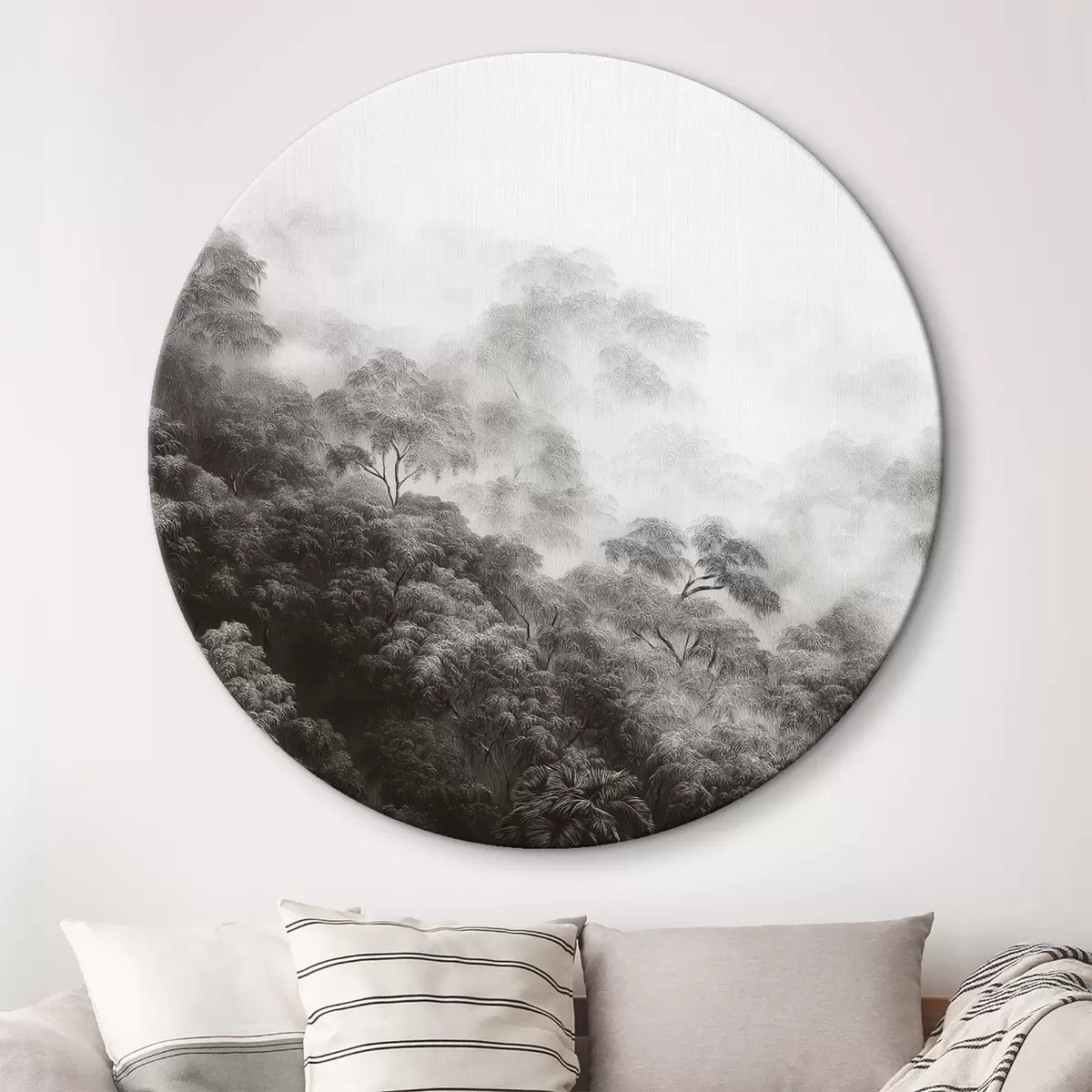 Кругла картина Тропічний ліс у тумані, пальми, сірі кольори Nr r42371v1
