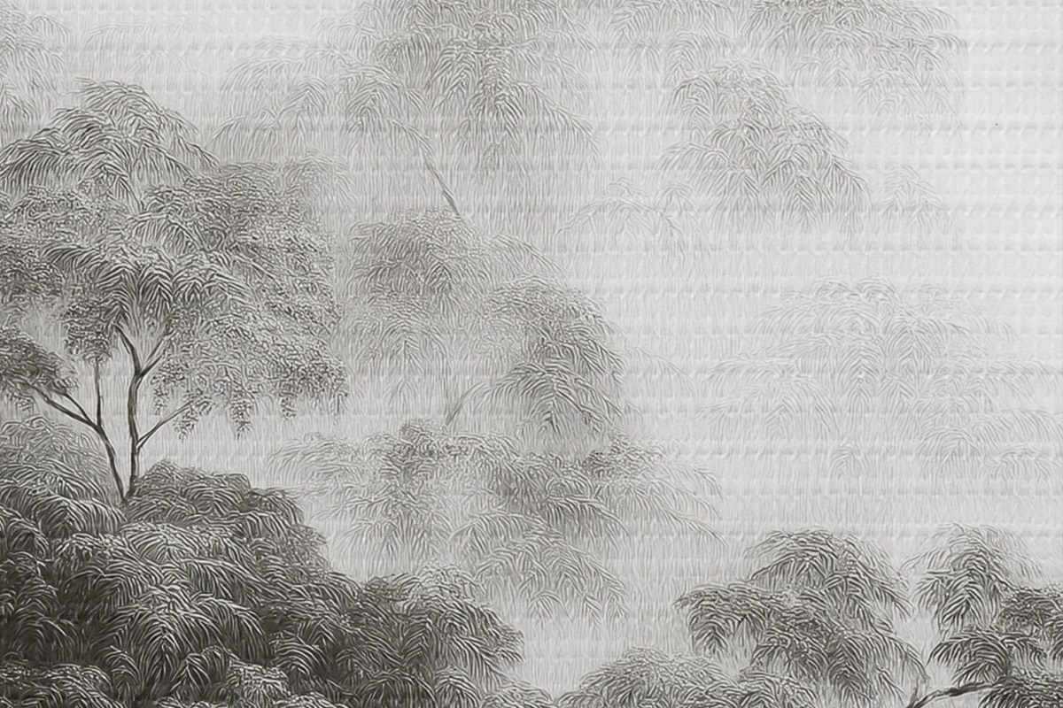 Кругла картина Тропічний ліс у тумані, пальми, сірі кольори r42371v1
