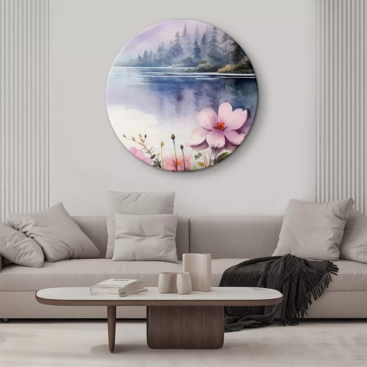 Кругла картина Рожеві квіти на тлі озера в горах r42393