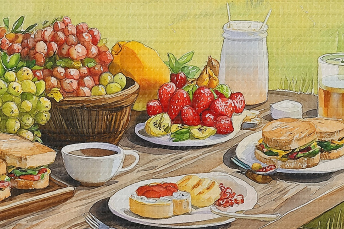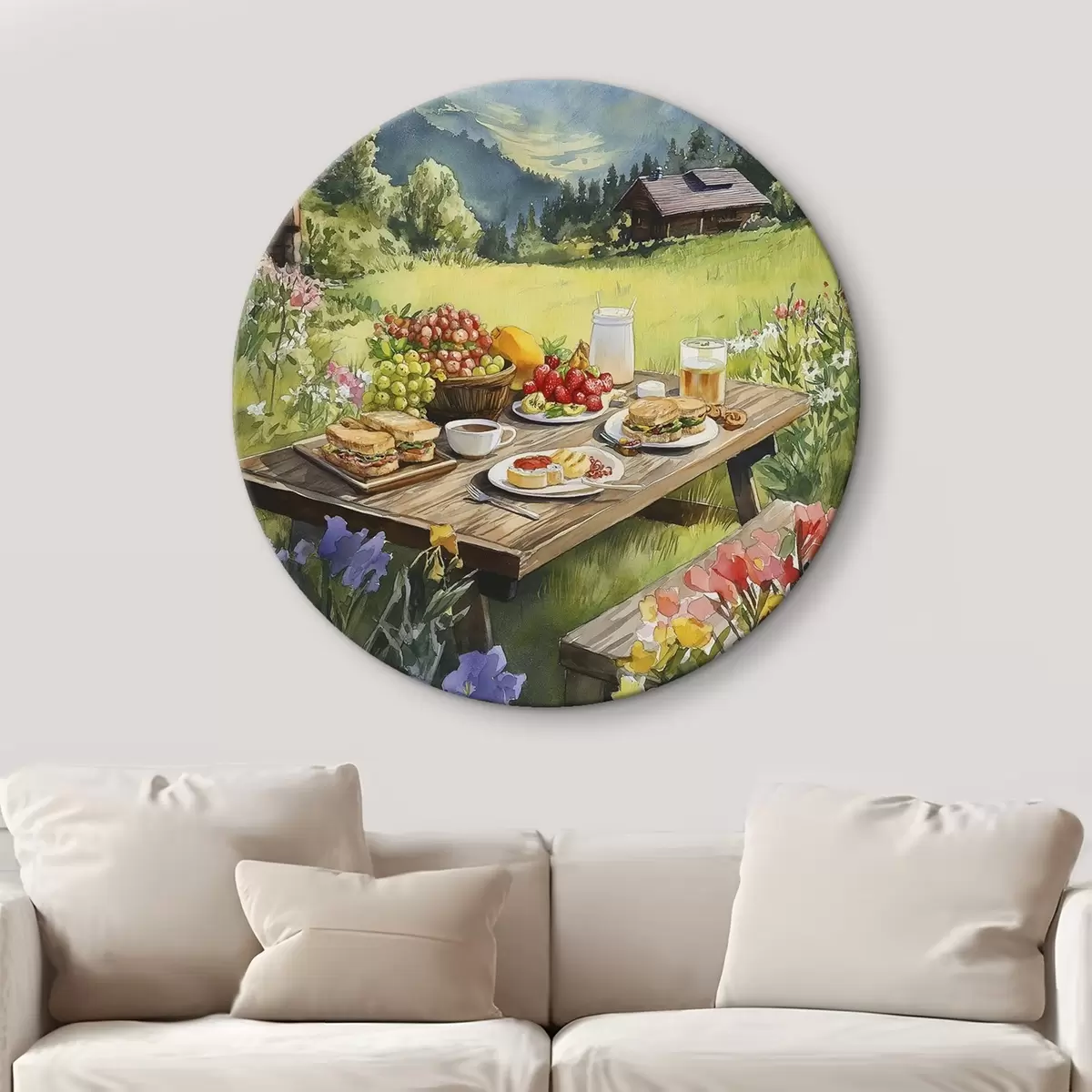 Кругла картина Гірські пейзажі, літня галявина, лісові будиночки, сніданок Nr r42425