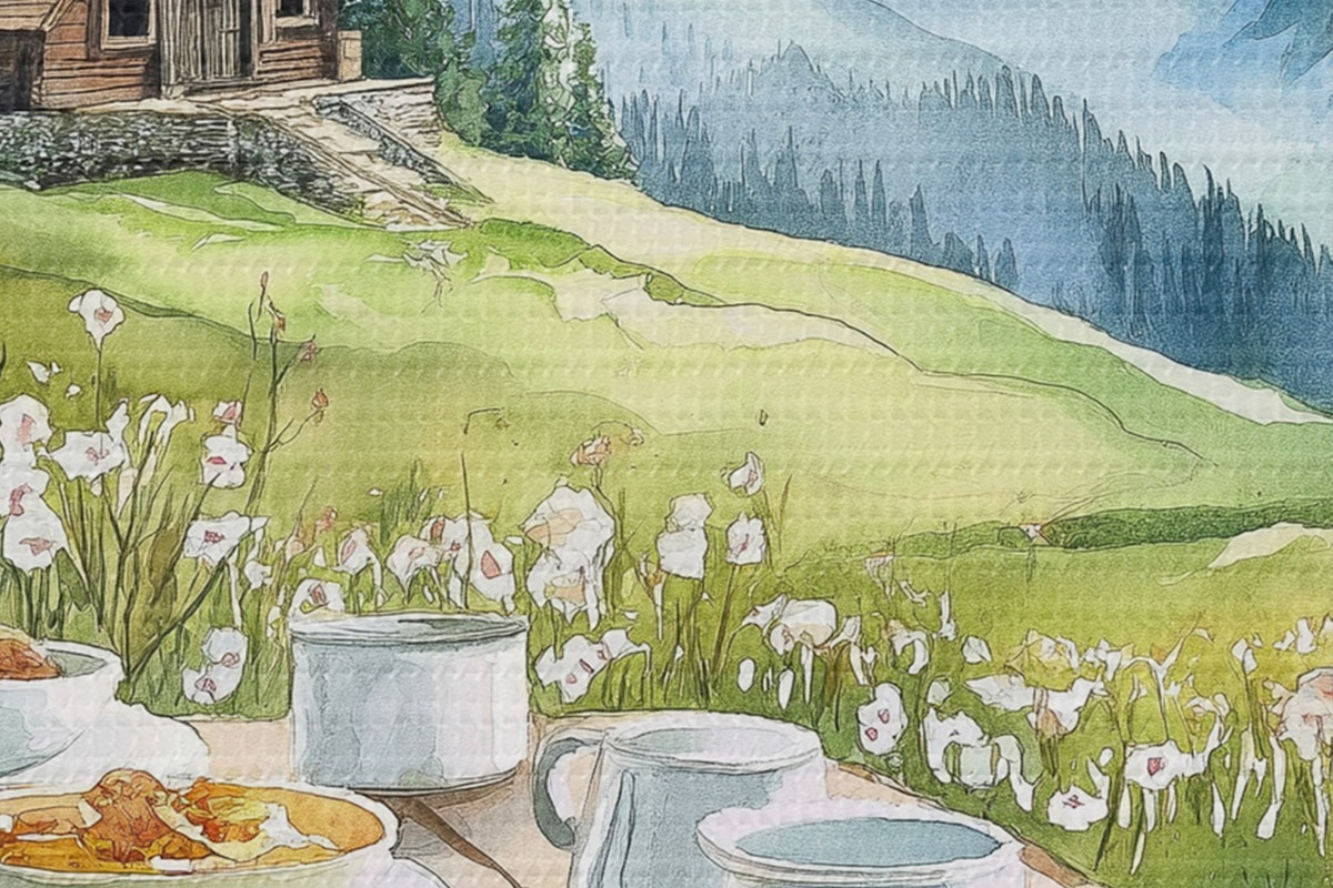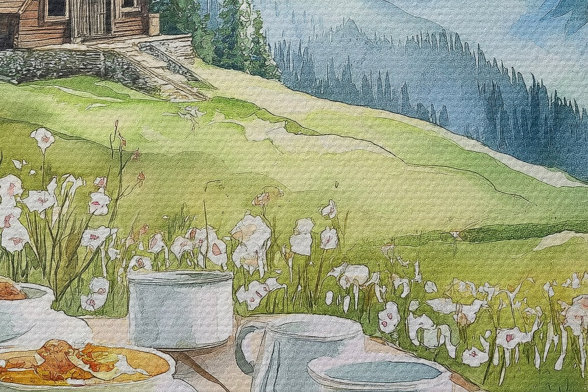 Кругла картина Сніданок в Альпах, гори, ліс, природа, літо, акварель Nr r42426