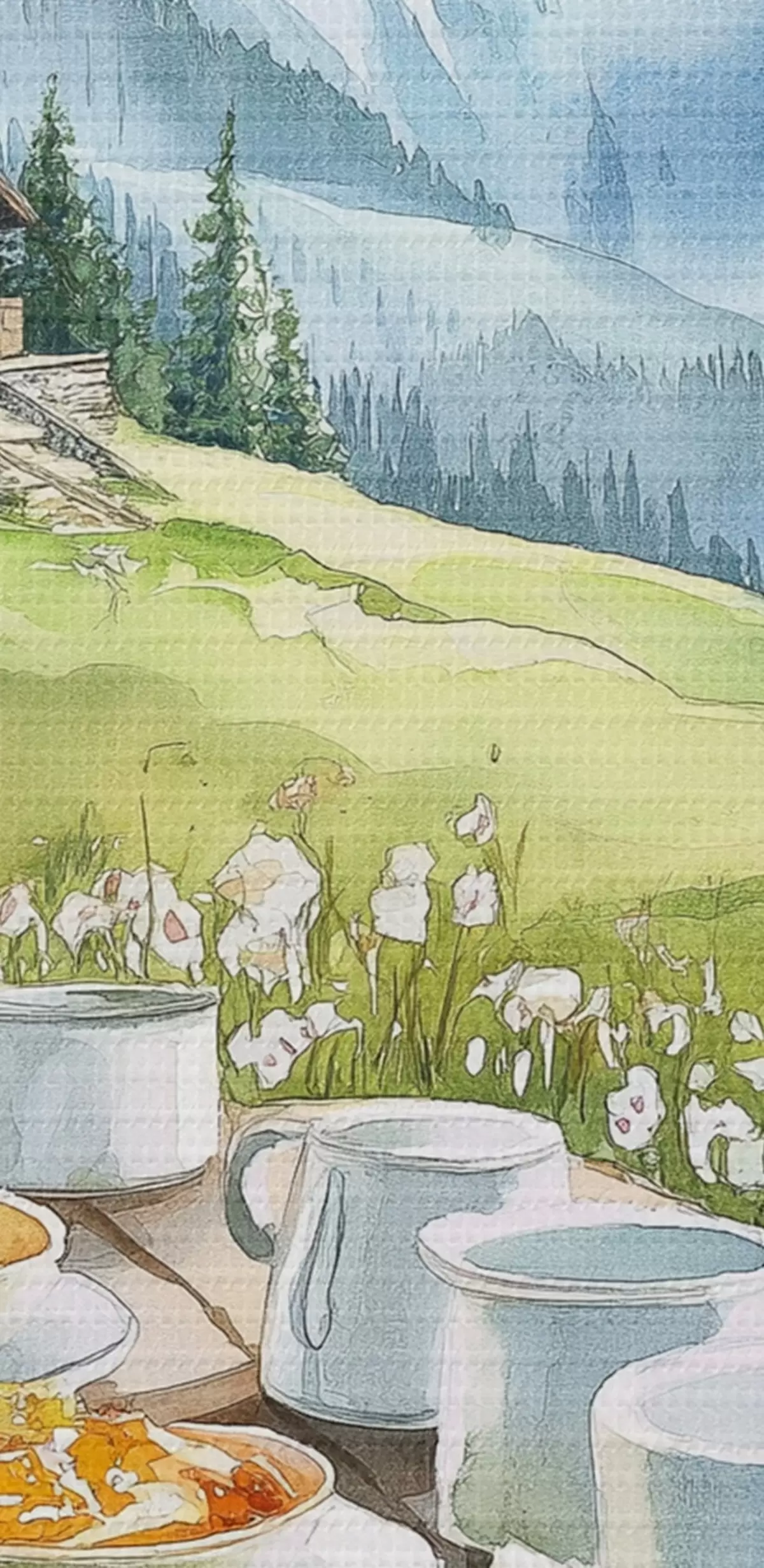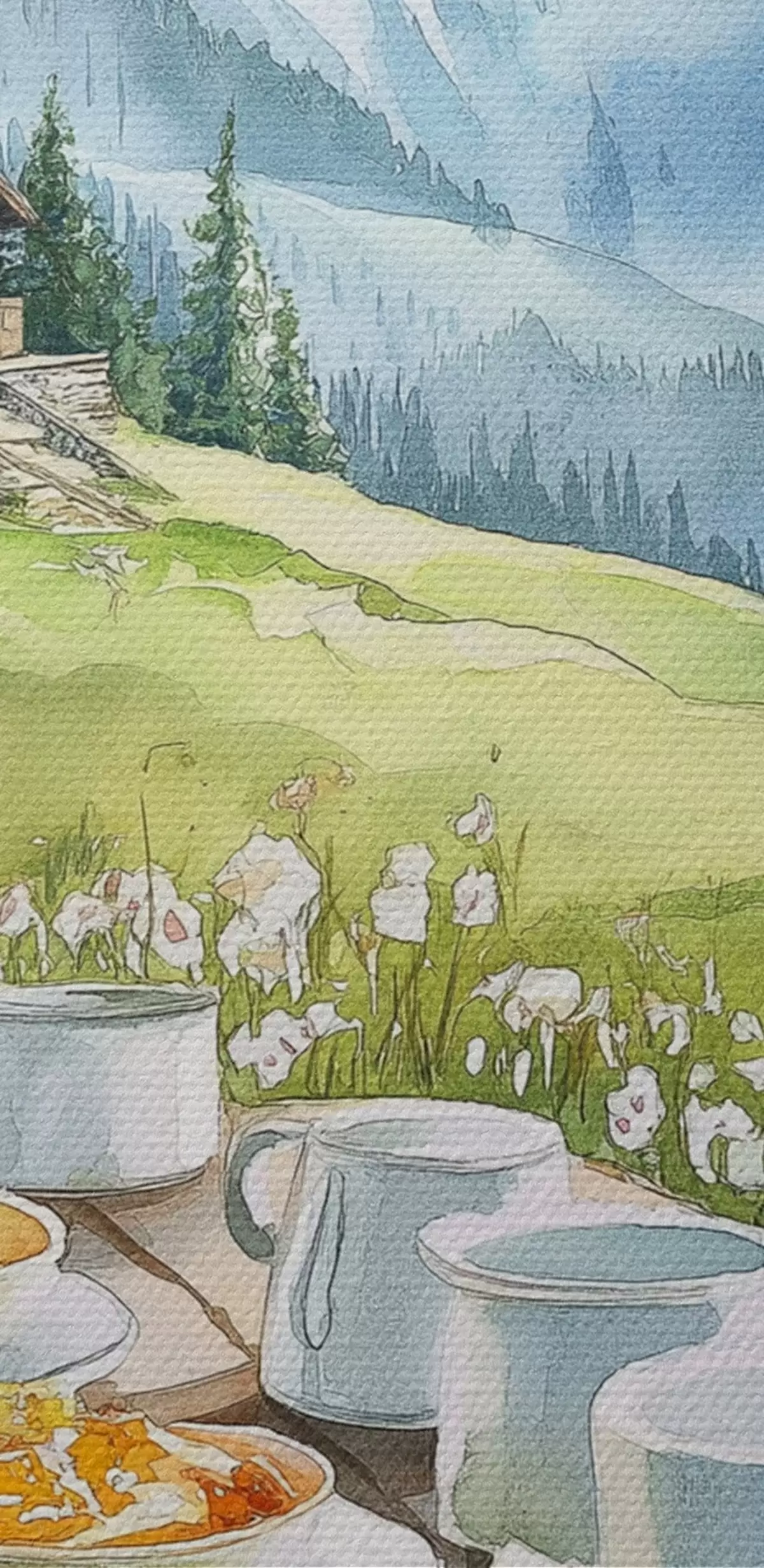 Кругла картина Сніданок в Альпах, гори, ліс, природа, літо, акварель r42426