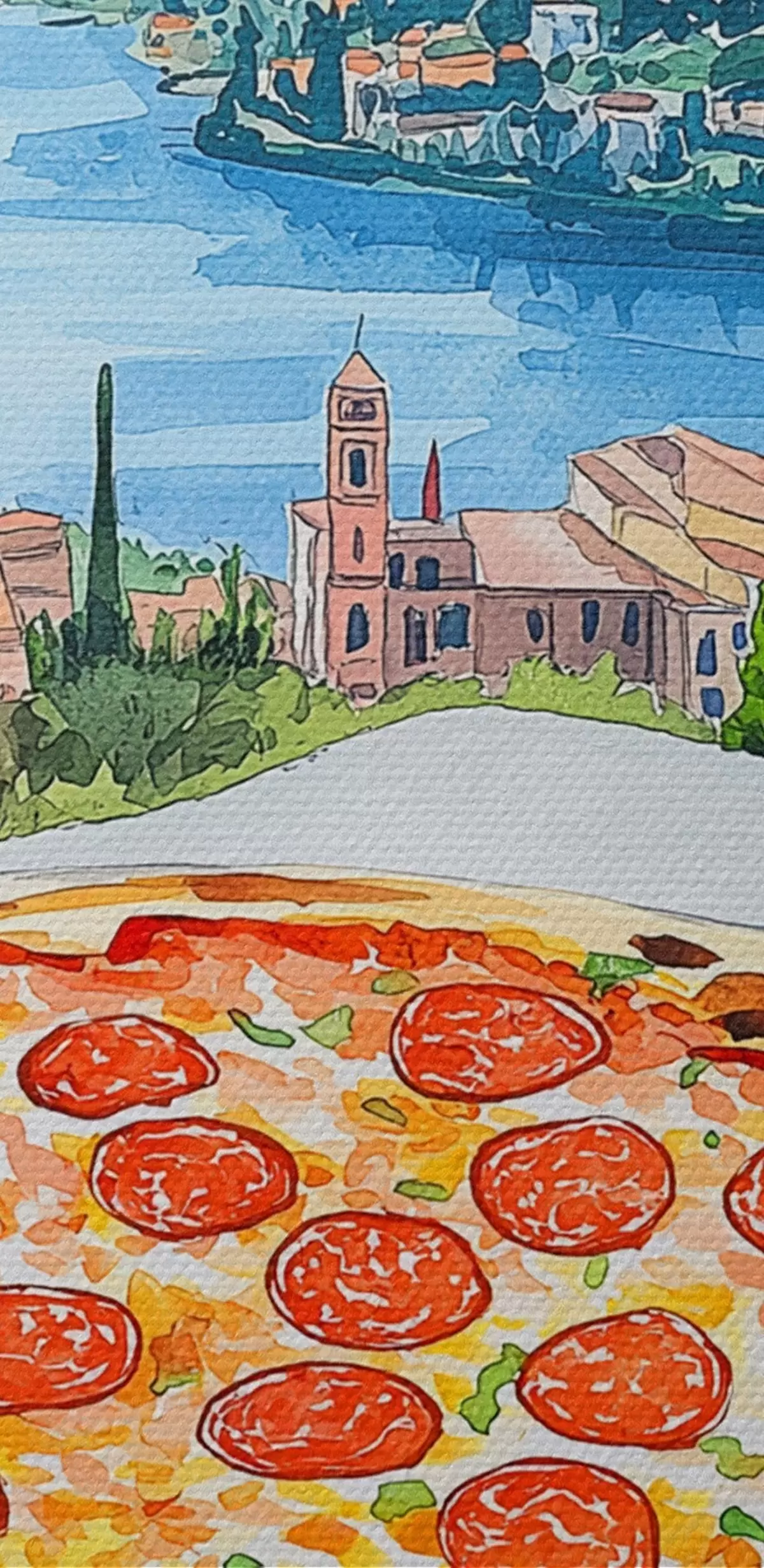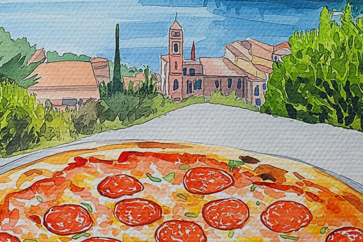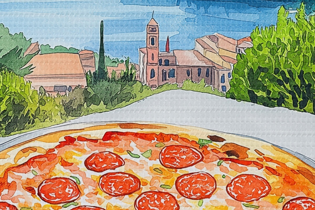 Кругла картина Акварельний стиль, Італія, піца, старе місто, гірський пейзаж r42435