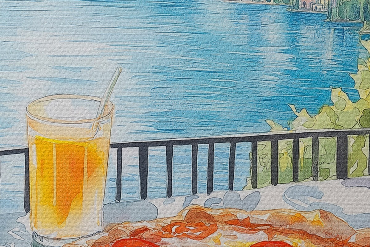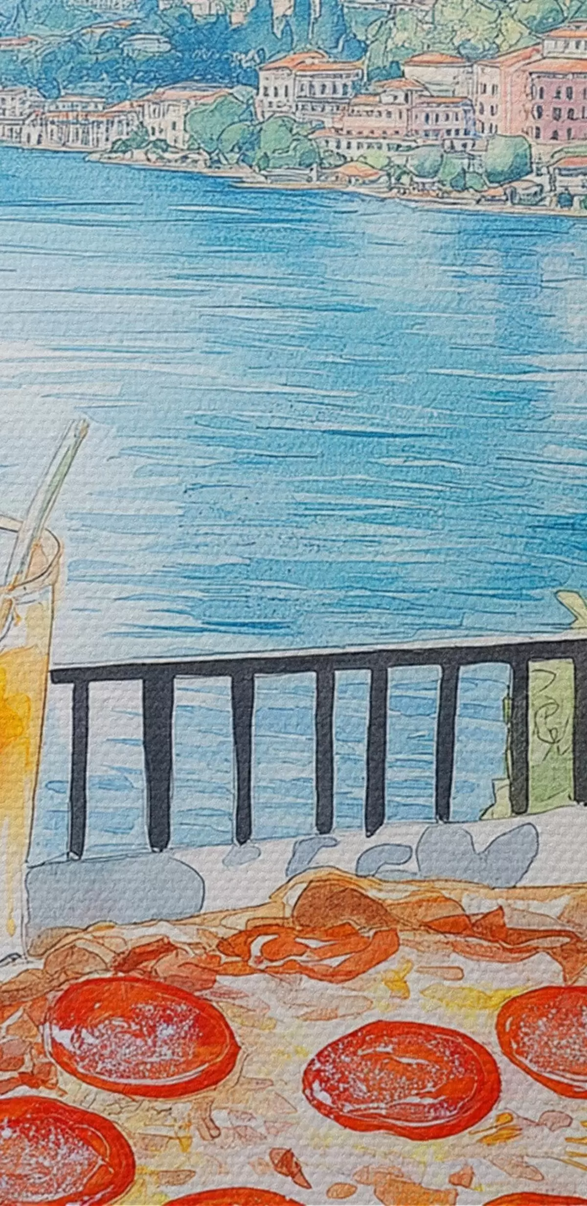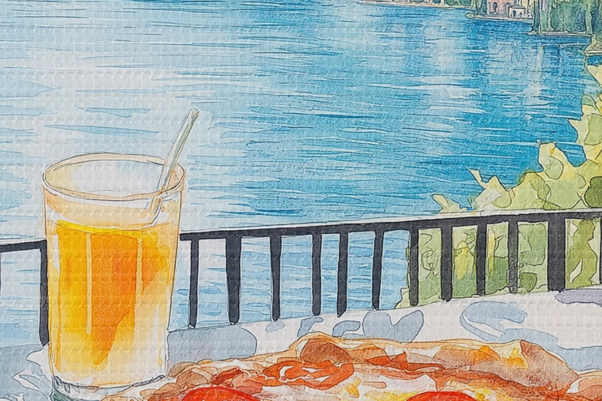 Кругла картина Бранч в Італії, акварельний стиль, піца маргарита, озеро, літня природа r42436