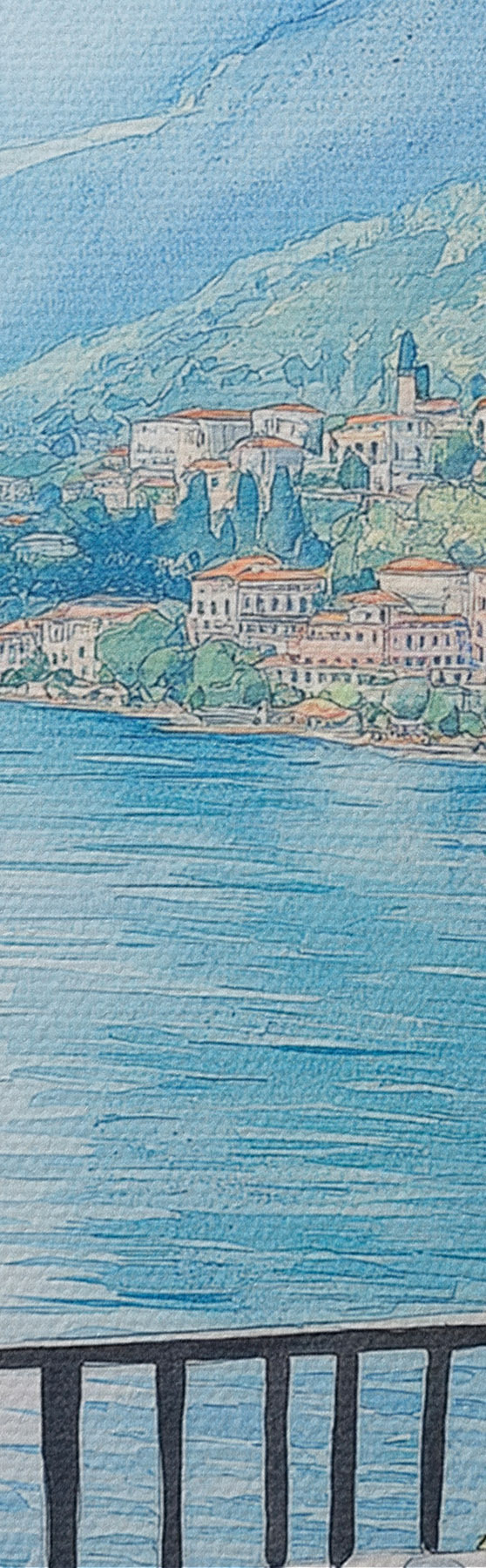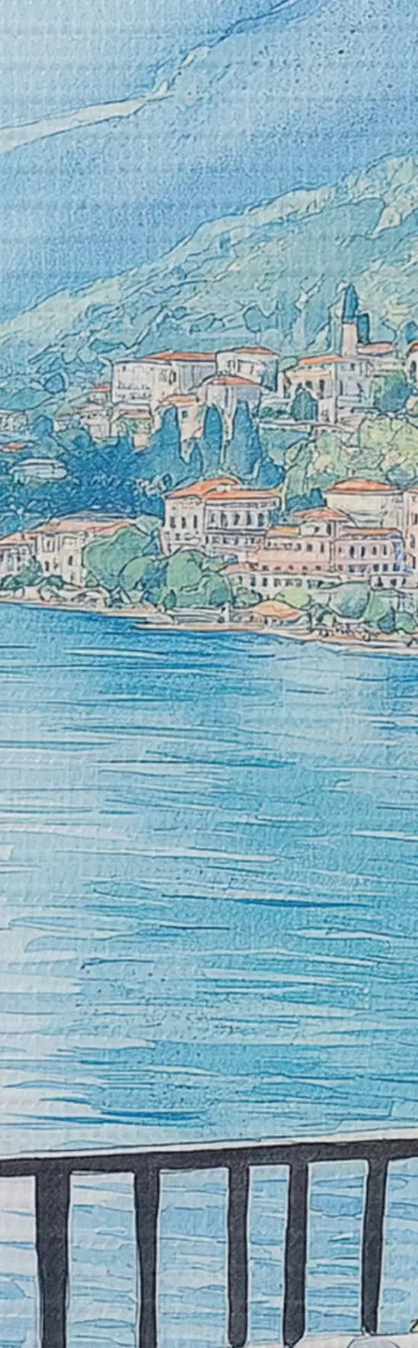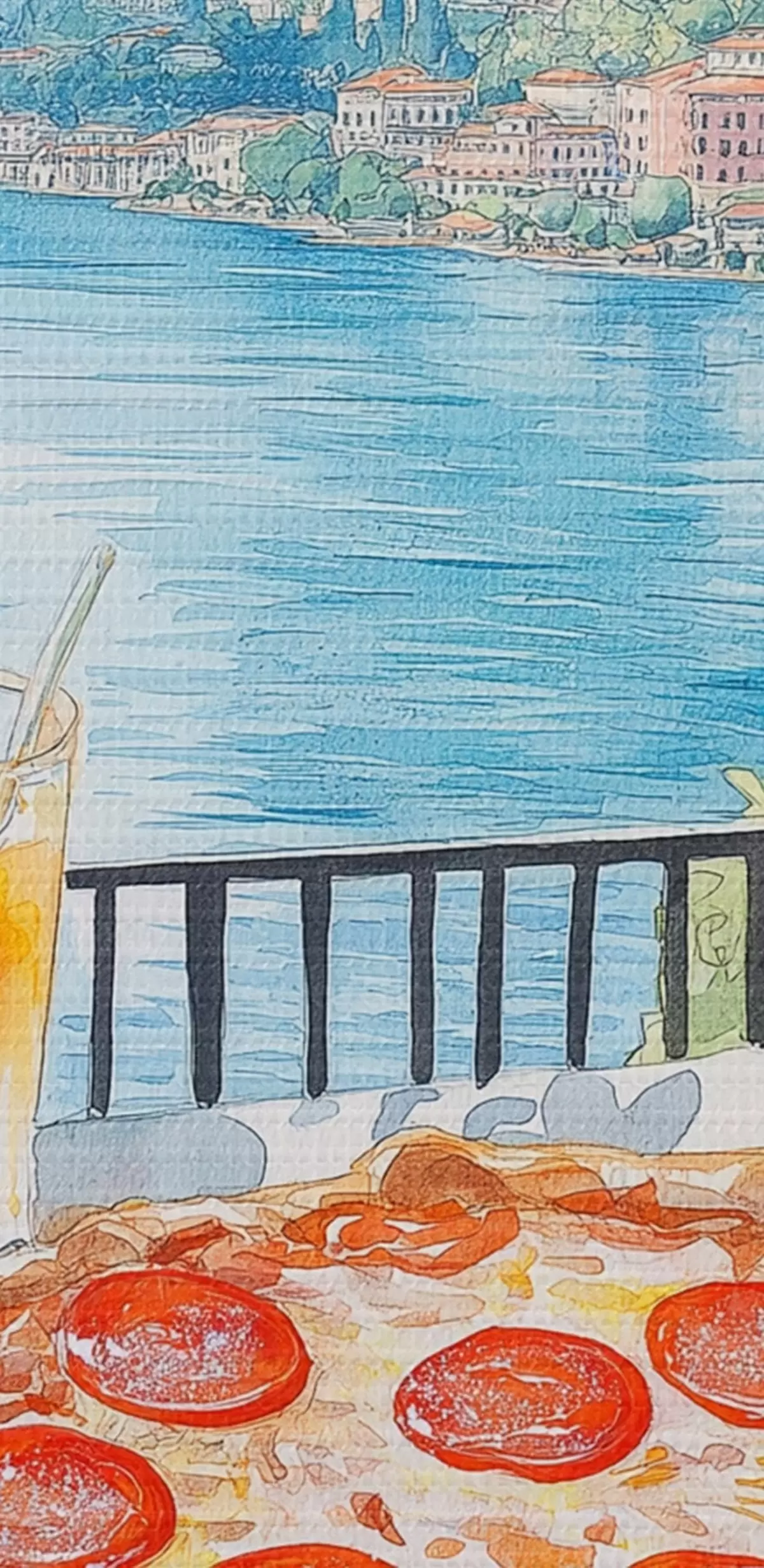 Кругла картина Бранч в Італії, акварельний стиль, піца маргарита, озеро, літня природа Nr r42436