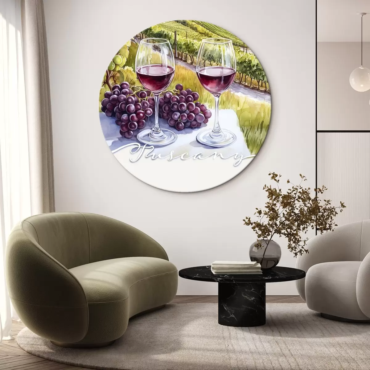 Кругла картина Пейзажі Тоскани, акварельний стиль, келихи, виноград, захід сонця r42439
