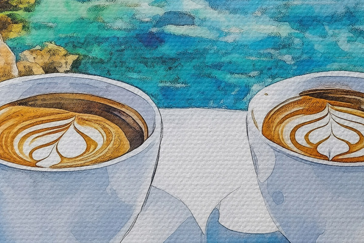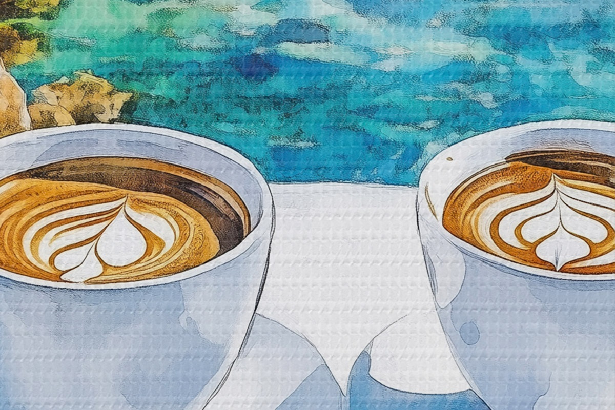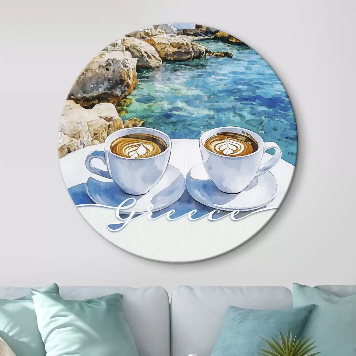 Кругла картина Естетика Греції, філіжанка кави, синє море, старе місто, подорожі r42447