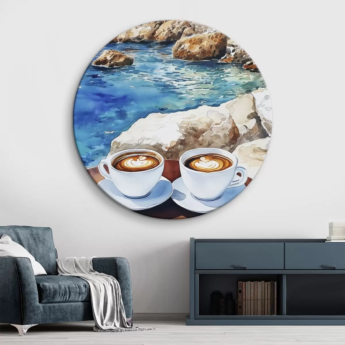 Кругла картина Акварель на березі моря з чашкою кави, літо Nr r42449
