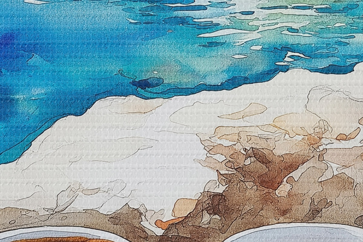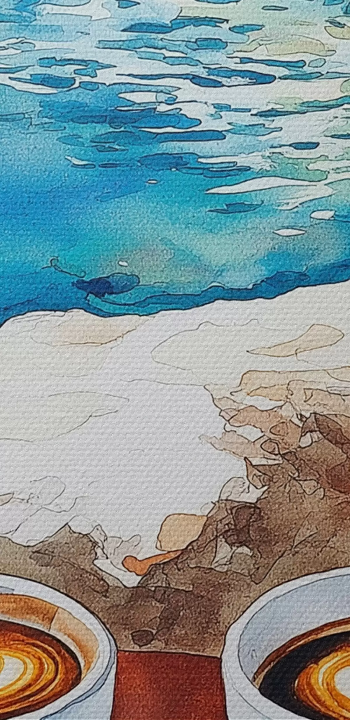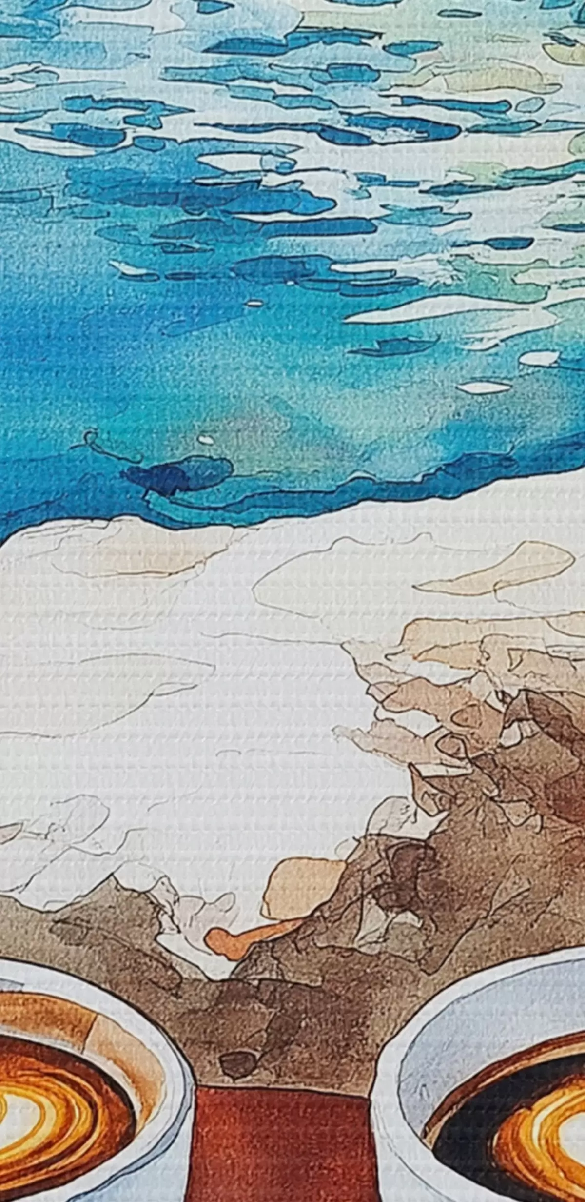 Кругла картина Акварель на березі моря з чашкою кави, літо r42449