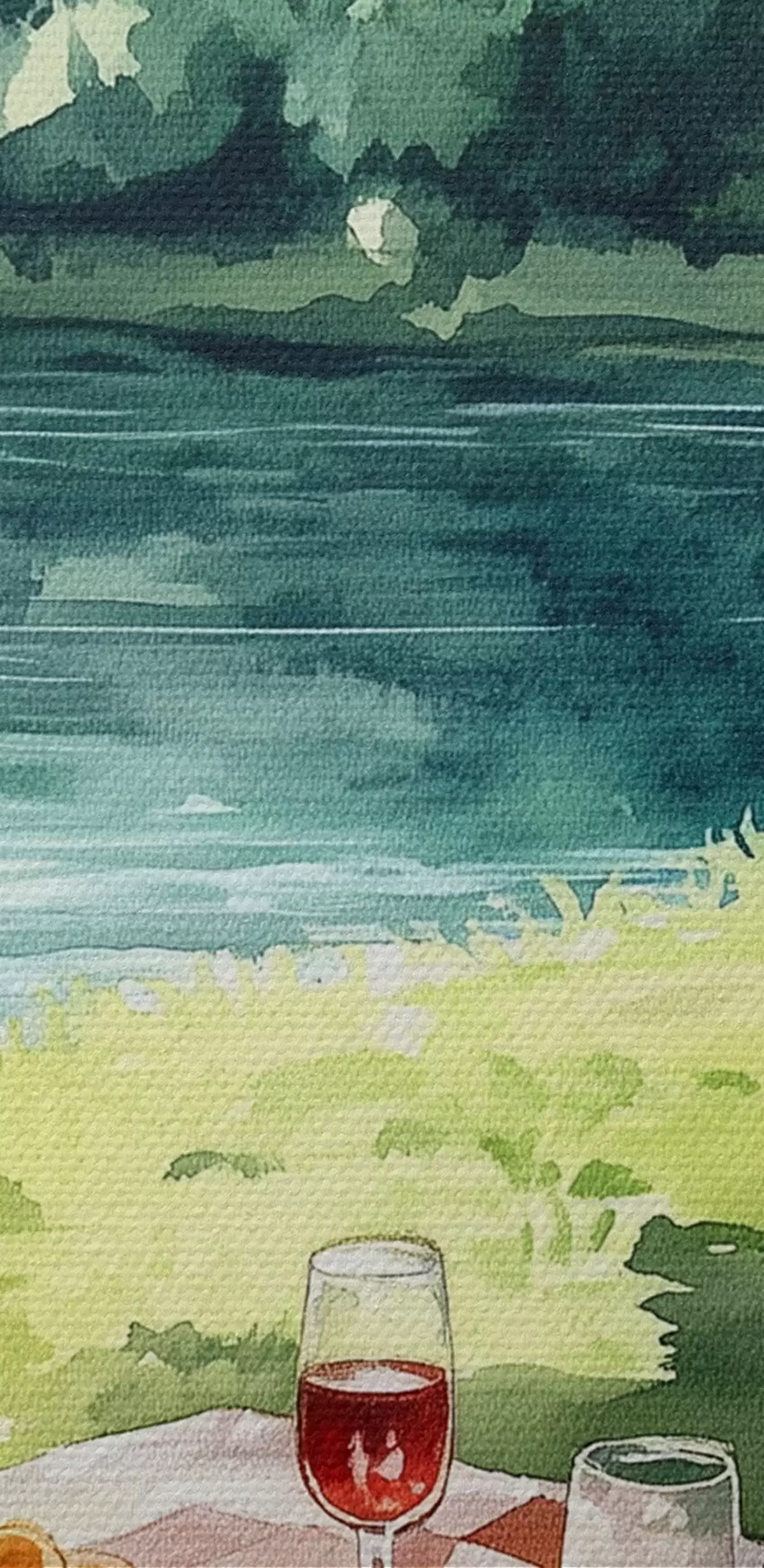 Кругла картина Гарний романтичний пікнік біля літнього озера, фрукти, зелень Nr r42451