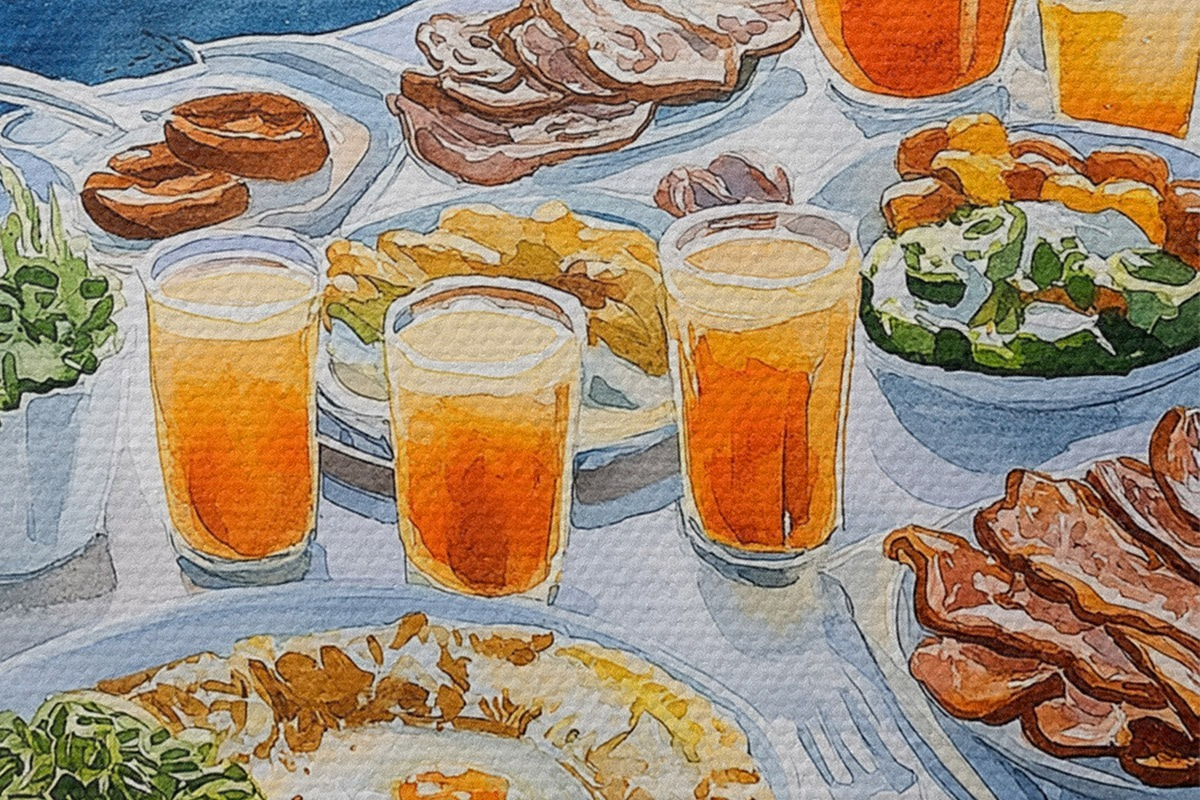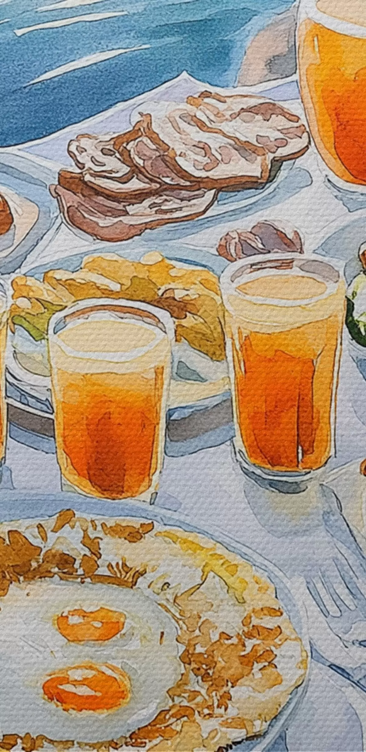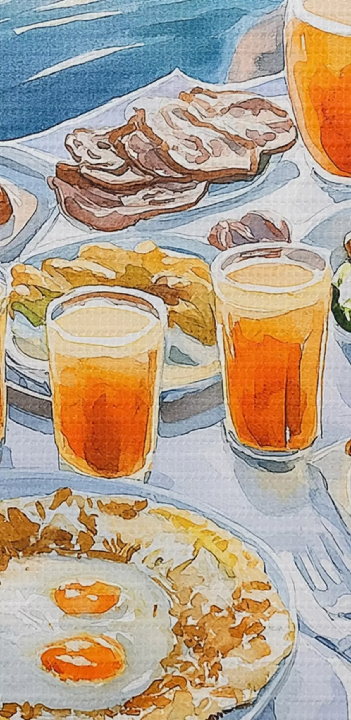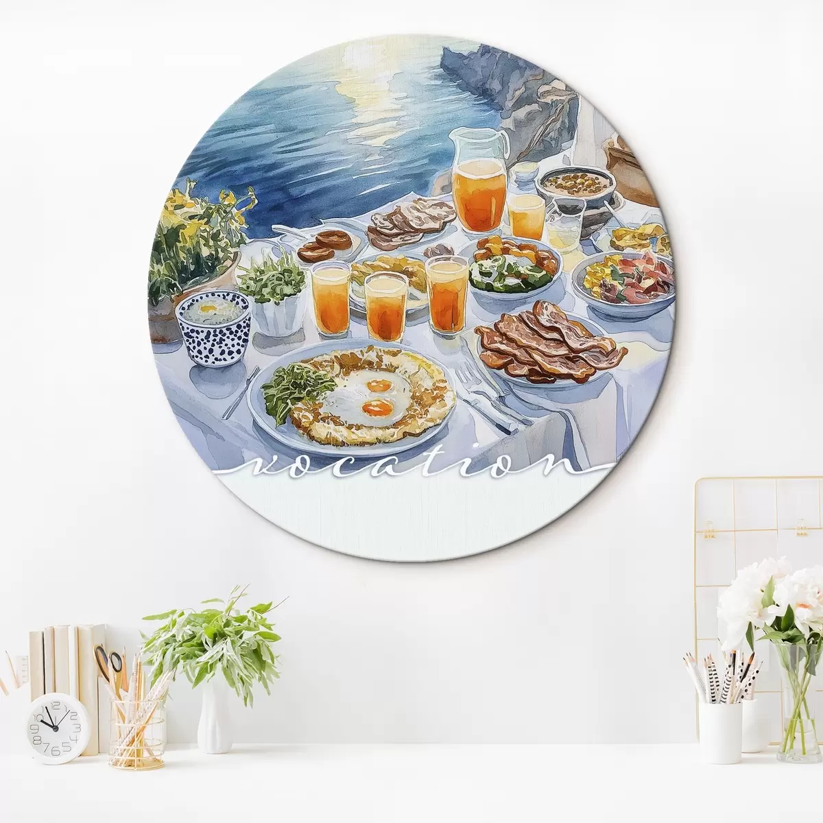 Кругла картина Романтичний відпочинок у Греції, акварельний стиль, сніданок, схід сонця Nr r42453