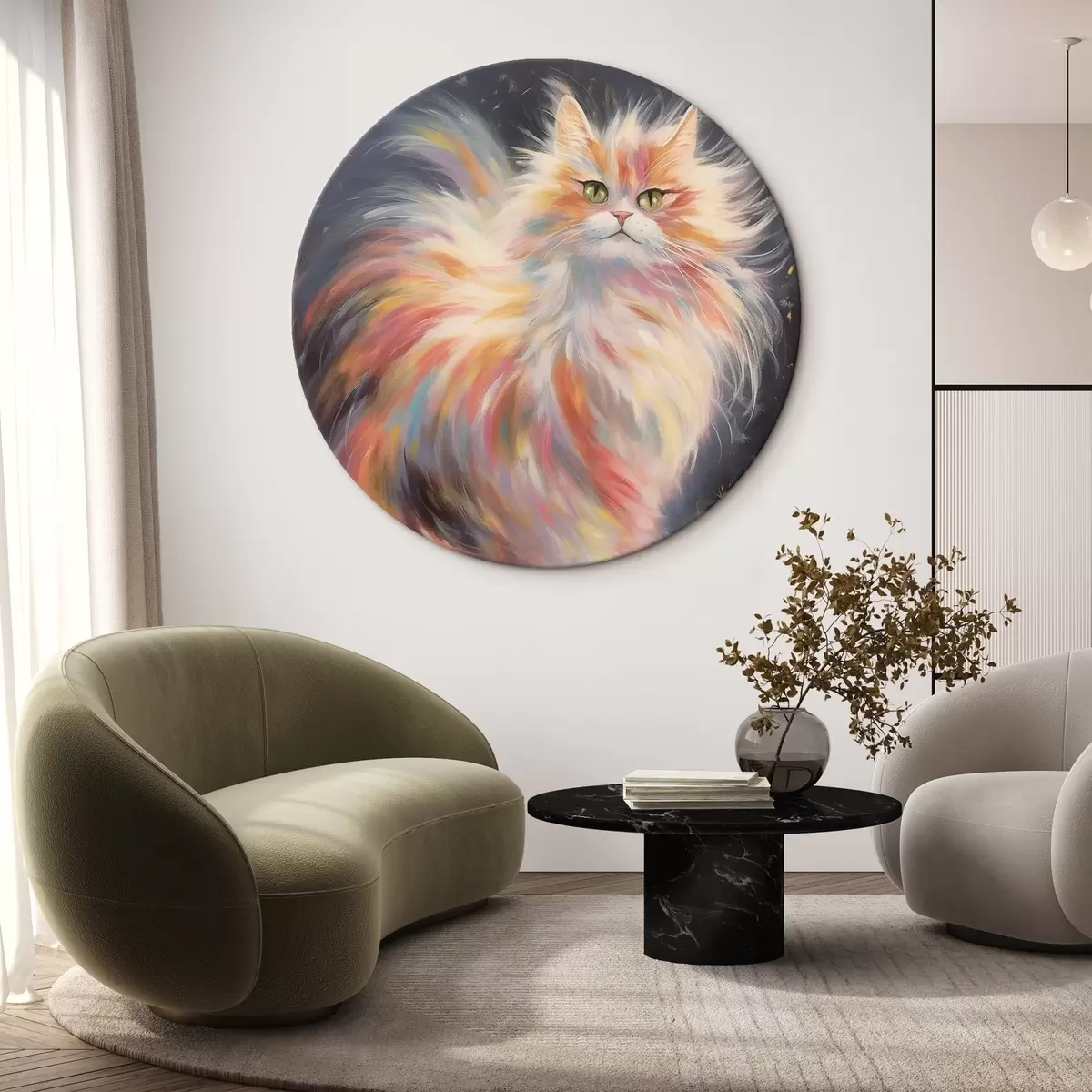 Кругла картина Пухнастий кіт з барвистим хутром на темному тлі Nr r42484